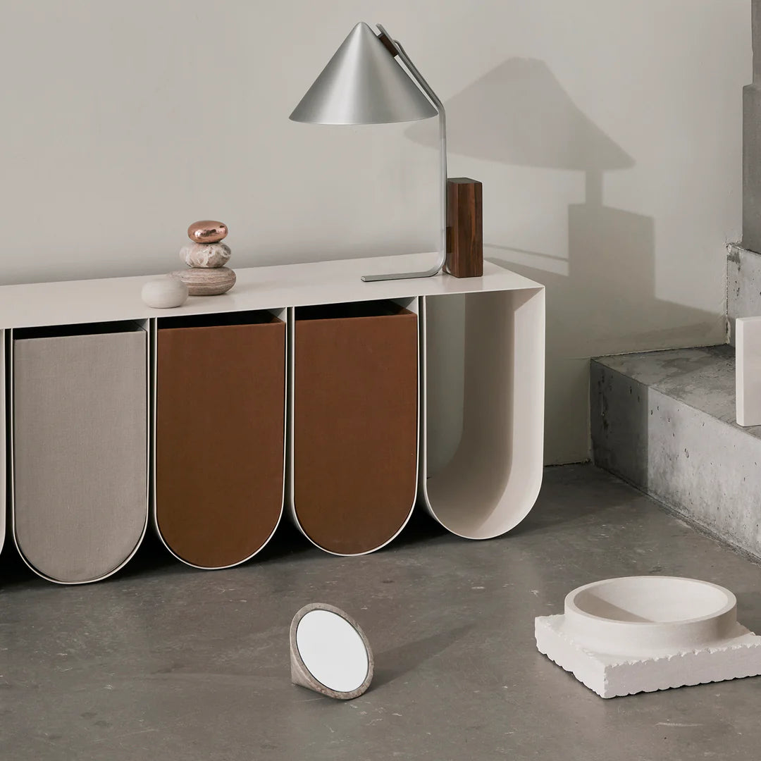The Curved Boxes are designed for the Curved Wall Shelf Curved Side Table and Curved Benches to add an elegant storage solution to the furniture. The Curved Boxes have a textile cover with references to an architect’s sketchbooks and are available in natural hues that work well with the existing colors of the Curved Collection.