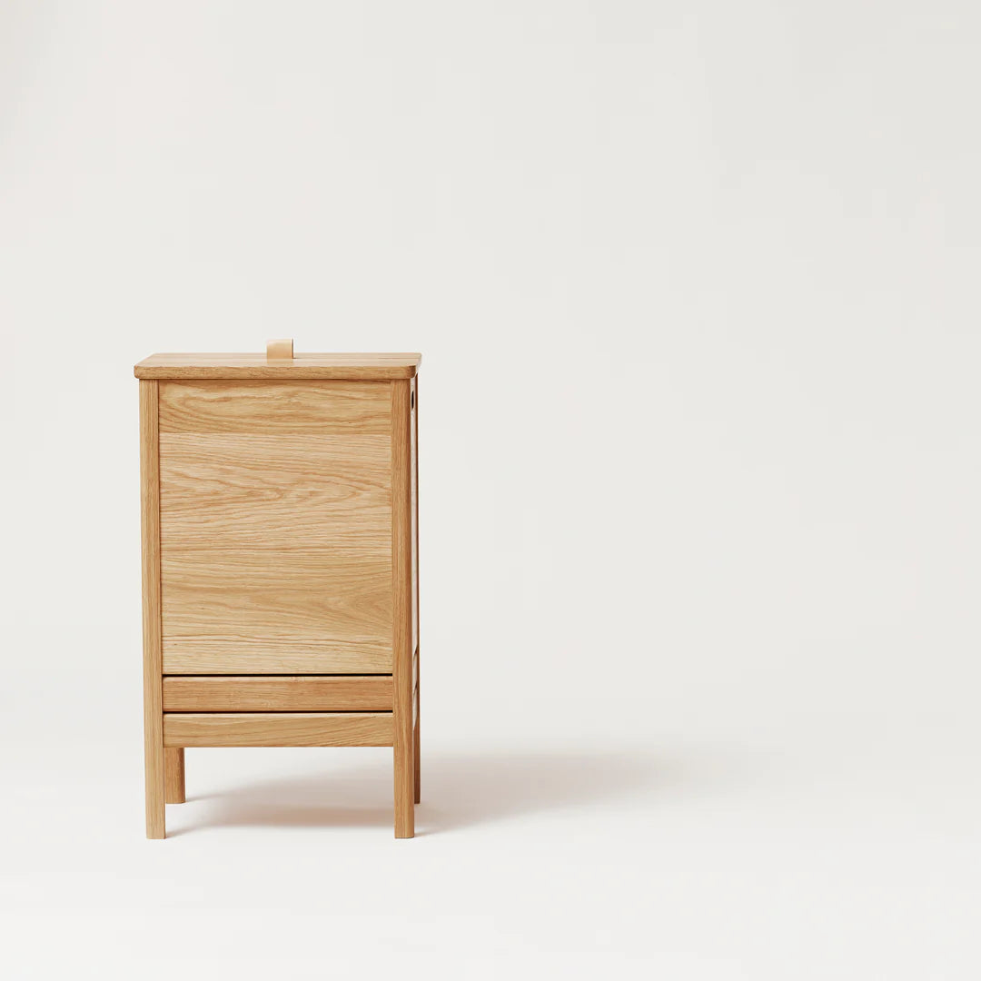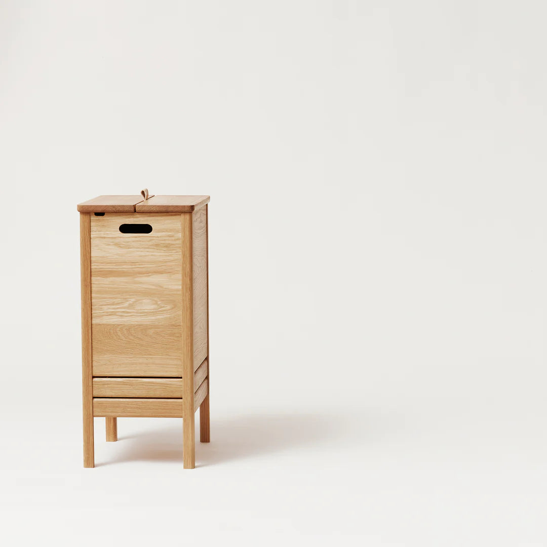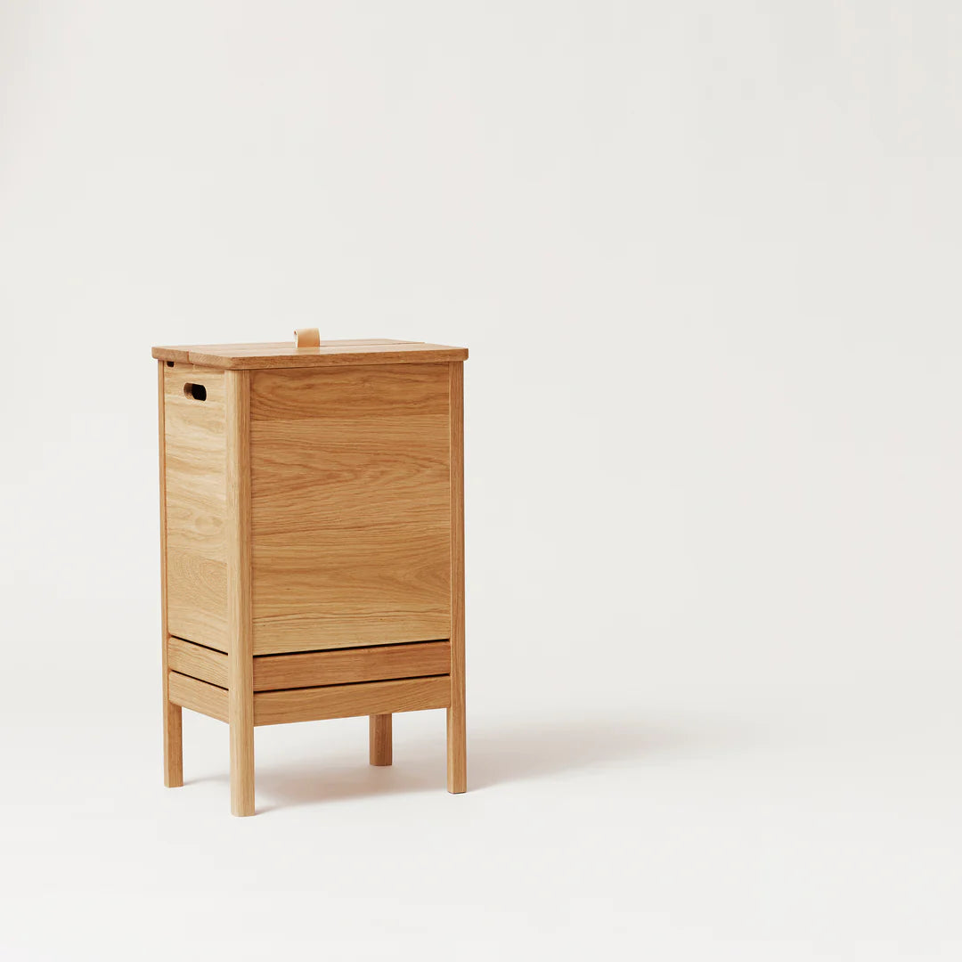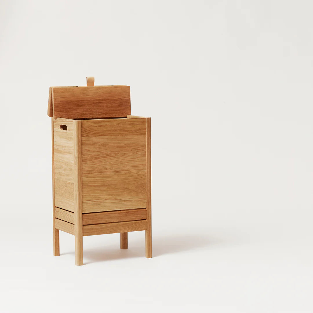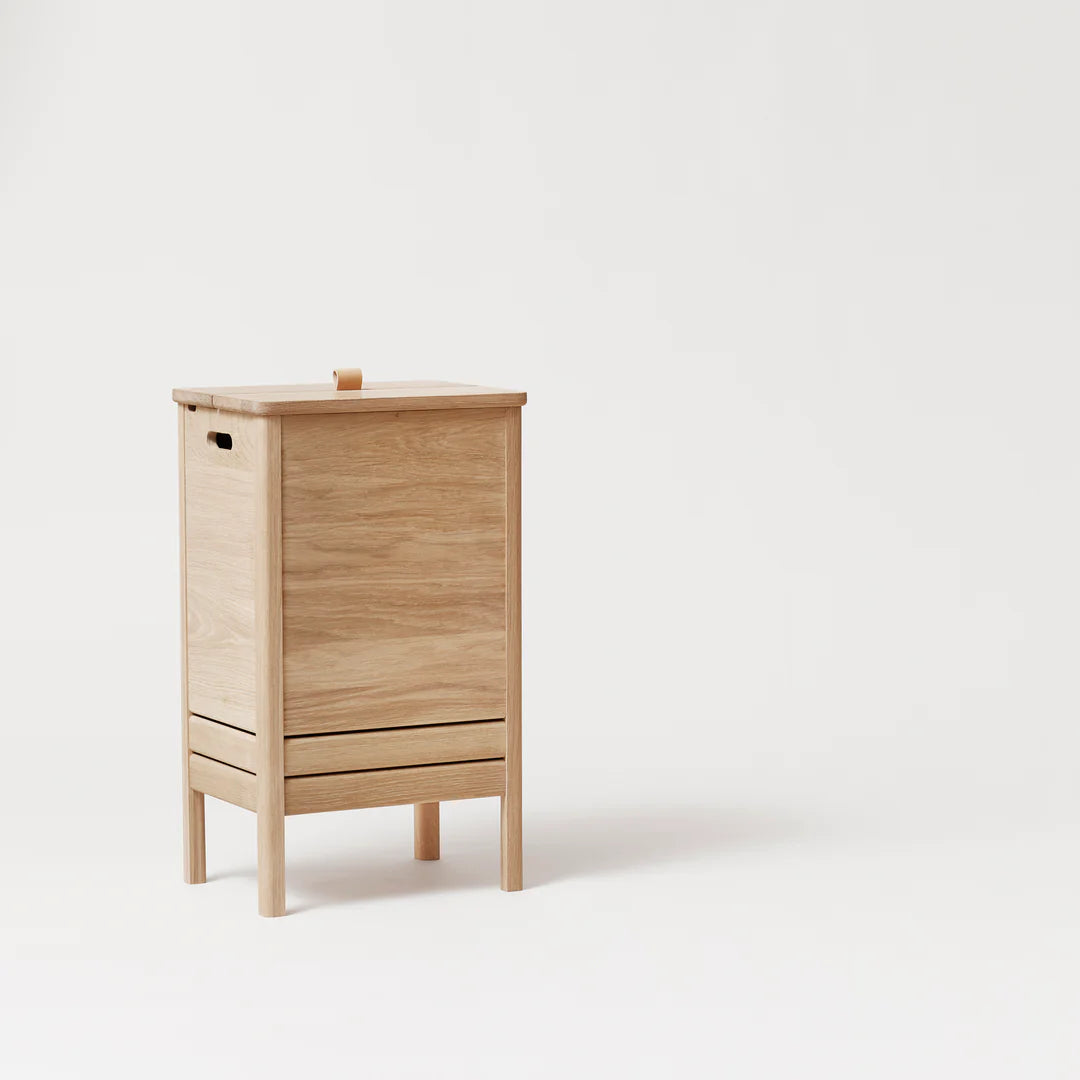 This laundry box is a rediscovered classic made of solid oak with highly durable quality. It is a very practical box with a large storage space. The lid is lifted by a small leather handle and the construction holds the lid in place while used. The handles on each side make it possible to move the box around easily while in use. The two straight lines let the air inside the box ventilate naturally, an important feature for a laundry box. The lower cut of the two legs and angles give it a feeling of being lifted up while the overall design is solid and robust. The A Line Laundry Box is a special piece of furniture that can take a prominent position in your home.