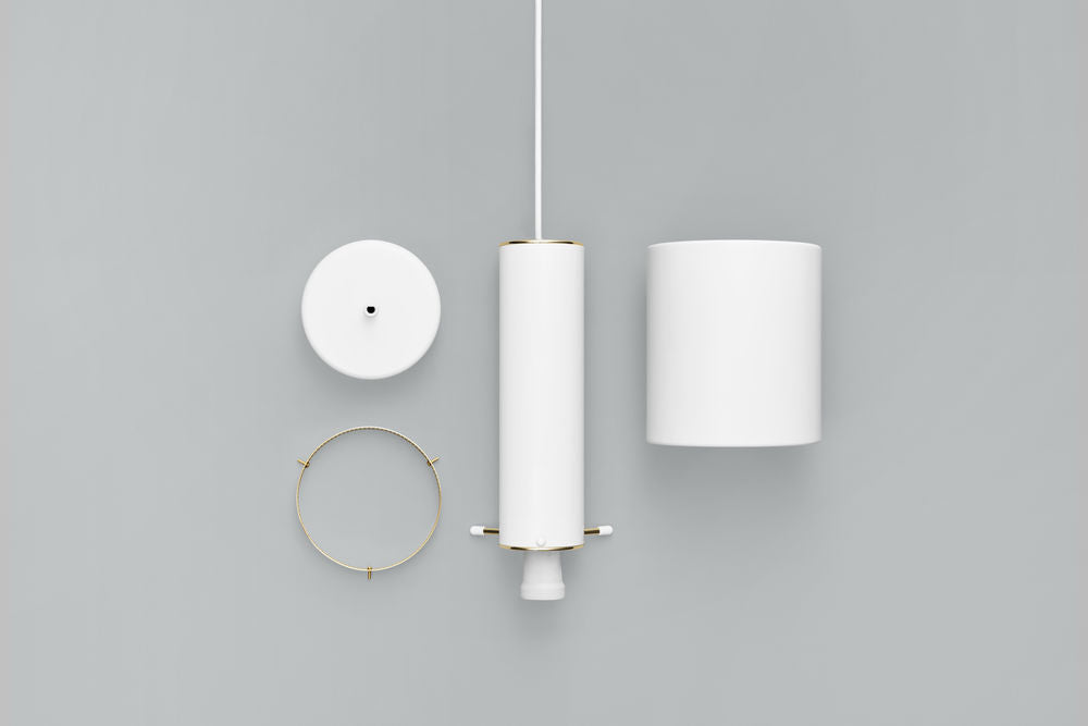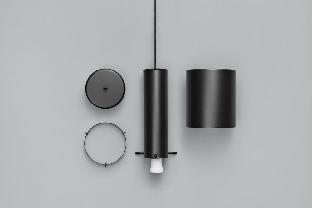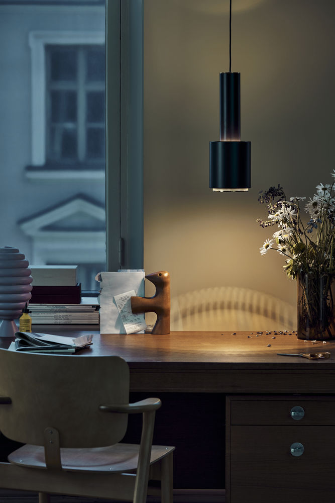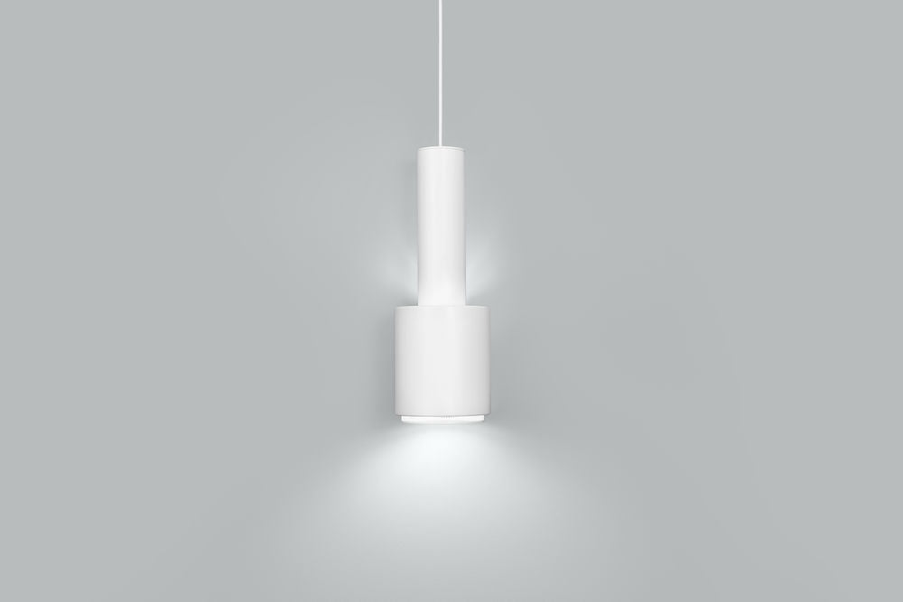 This elegant pendant light is nicknamed “Hand Grenade” for its distinctive shape. Composed of a lacquered steel shade and an inner ring, Pendant Light A110 provides an exceptional warm-toned quality of light. “Hand Grenade” projects both direct and indirect light onto ceilings, and its perforated inner ring creates a halo effect around the pendant light while simultaneously reducing glare.