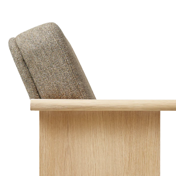 A compact padded lounge chair with a distinctive wooden side panel and elegant textile upholstery that combines pure, durable raw materials and soft ergonomic shapes. The chair is intended as a versatile piece of furniture that provides generous comfort despite its minimal footprint. The high-quality textile has detailed visible stitching on both the back and front of the seat.