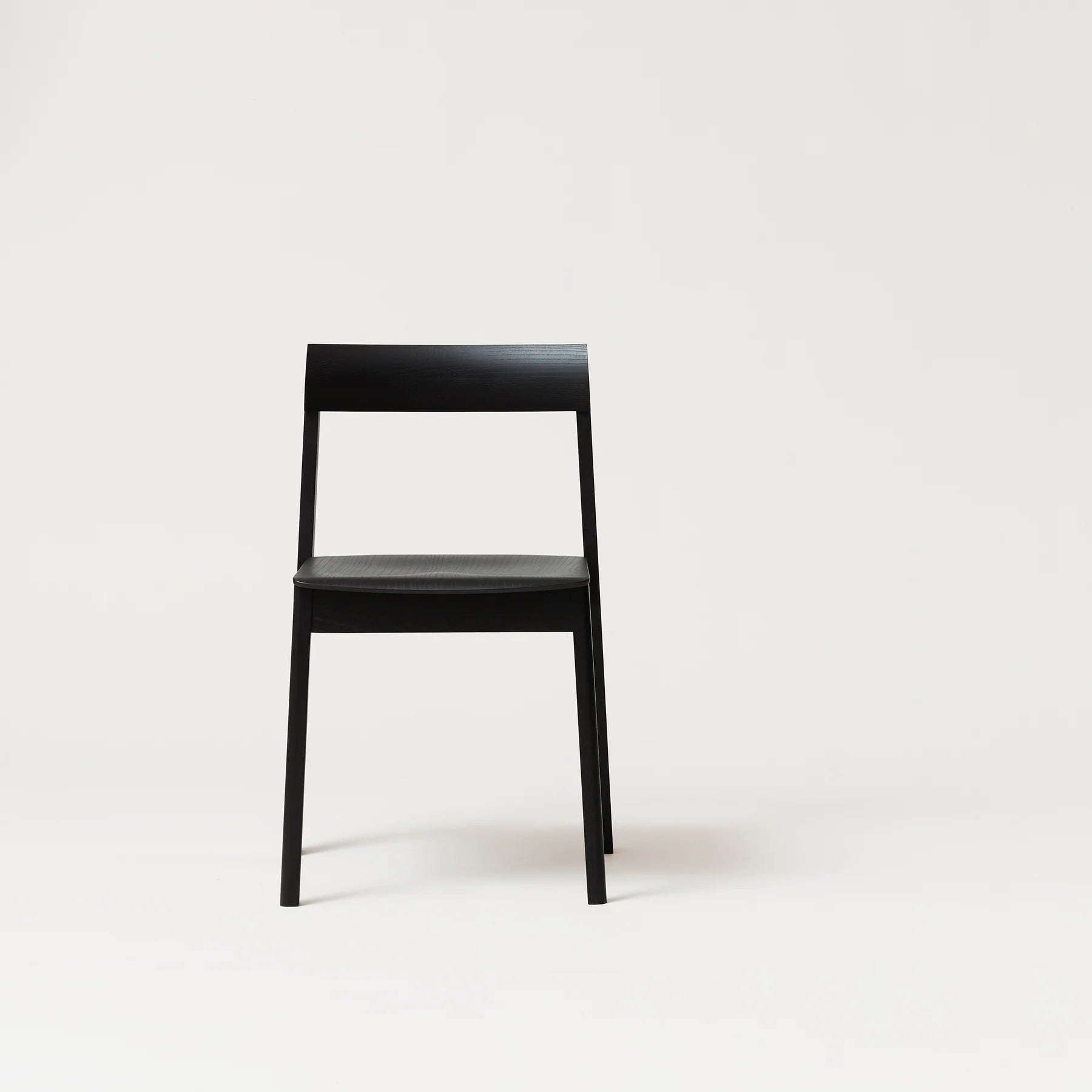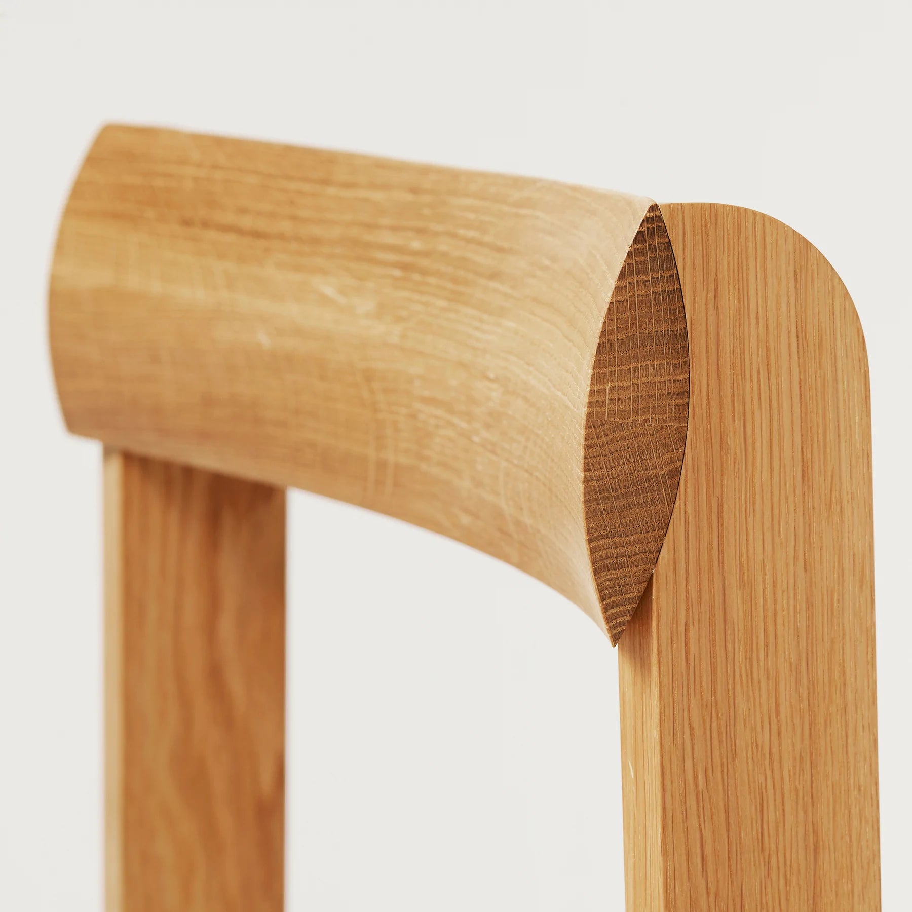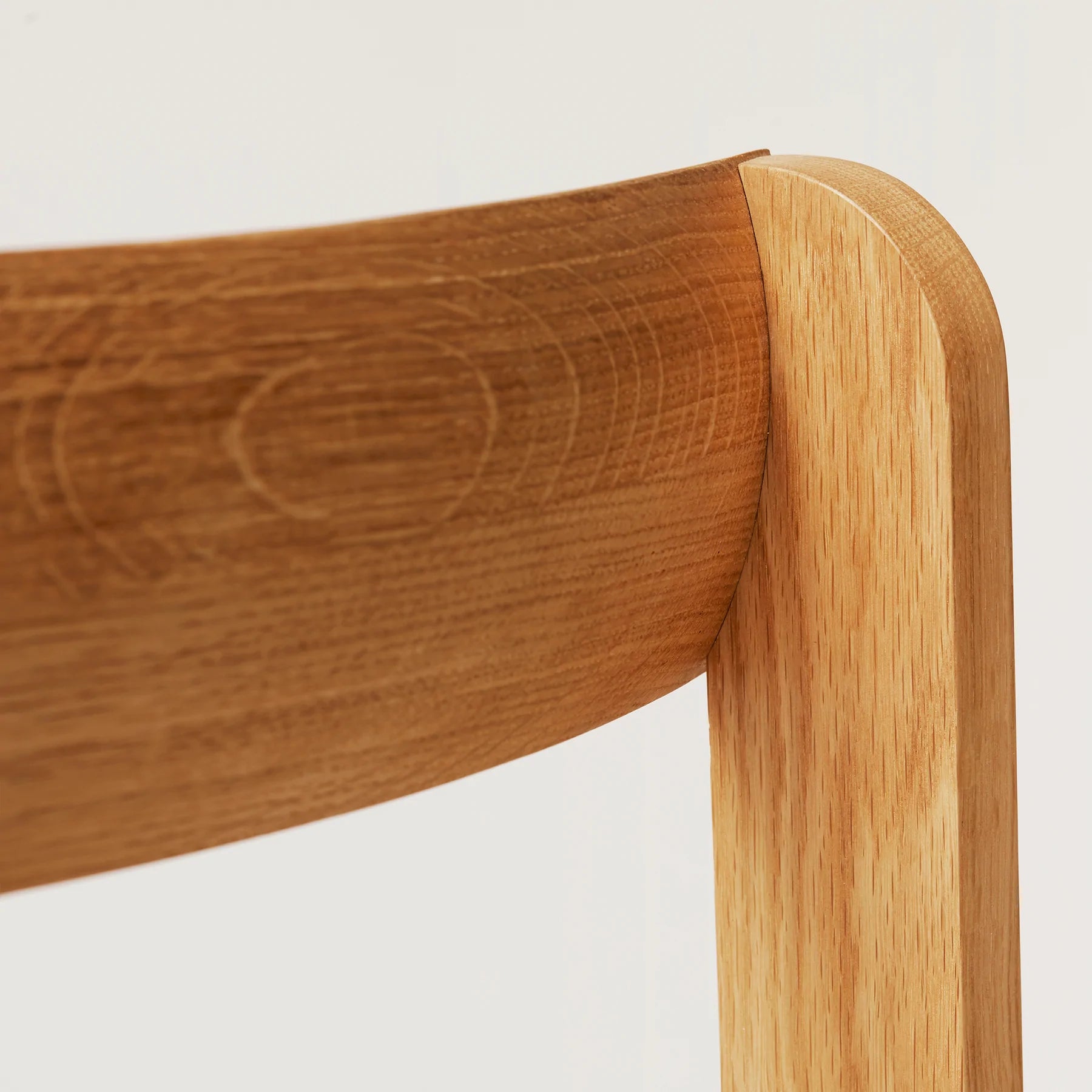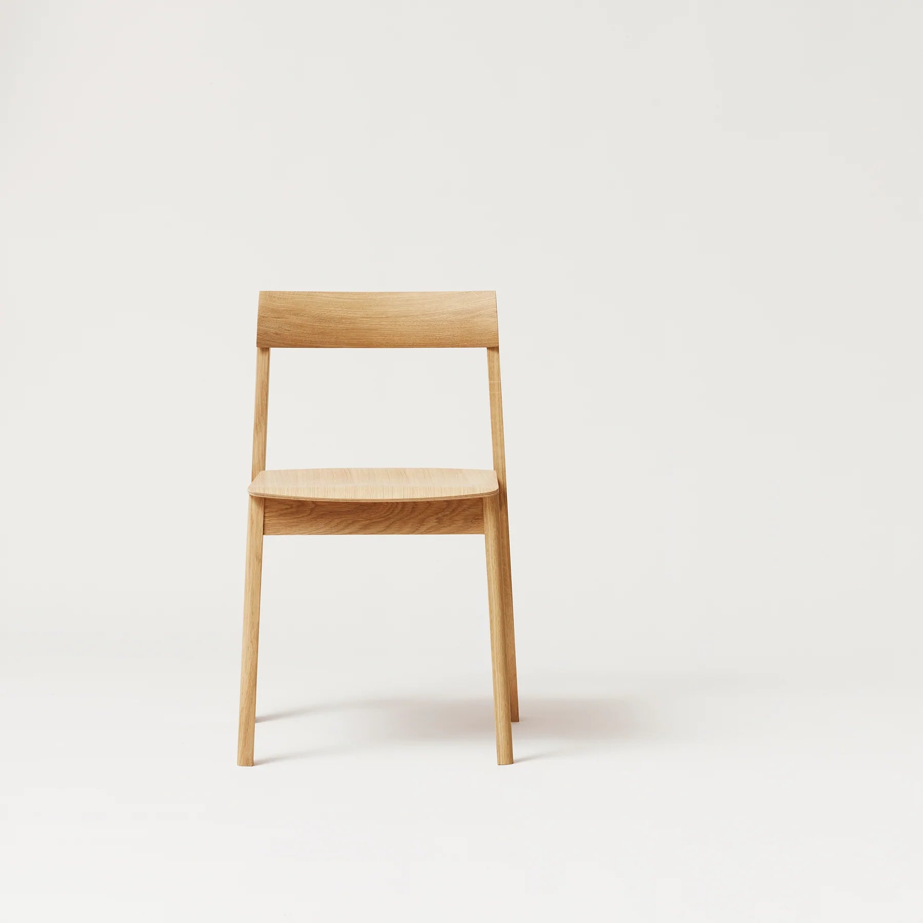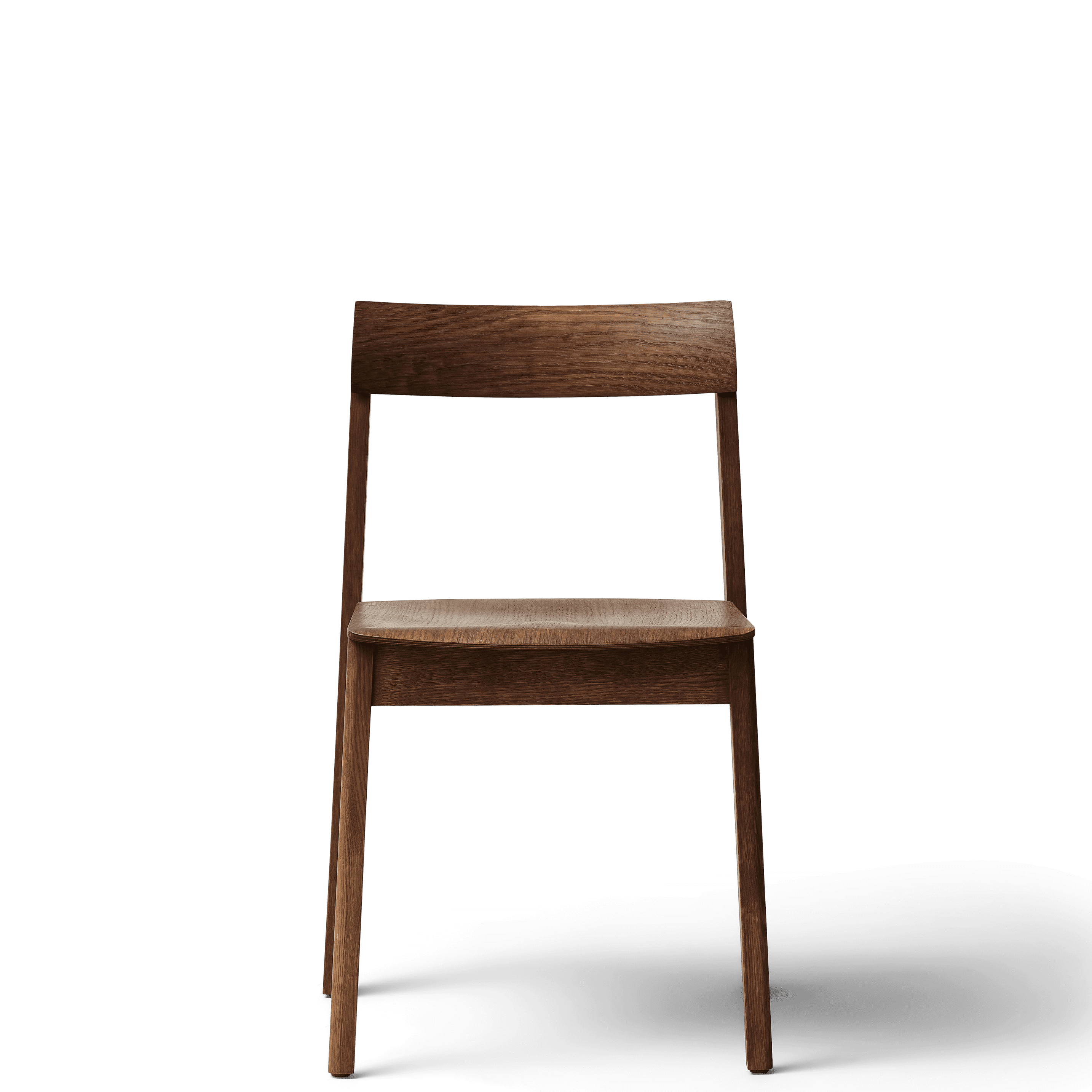 This is an archetypical chair by Form & Refine – a chair made completely out of wood. The extraordinarily shaped seat inspired by the human body supports a good comfort. In addition, the solid organically shaped backrest gives the chair a minimalistic and personal feature. Strong, solid legs combined with the veneer seat add to the surprising lightness and stunning visual sharpness of the chair. The exquisite backrest is made out of one solid piece of wood and steam bent from the front and back. There are no visible screws. You can stack up to five chairs. The chair is made to fit all desires – hospitality, office or private use. It is made of local certified wood.