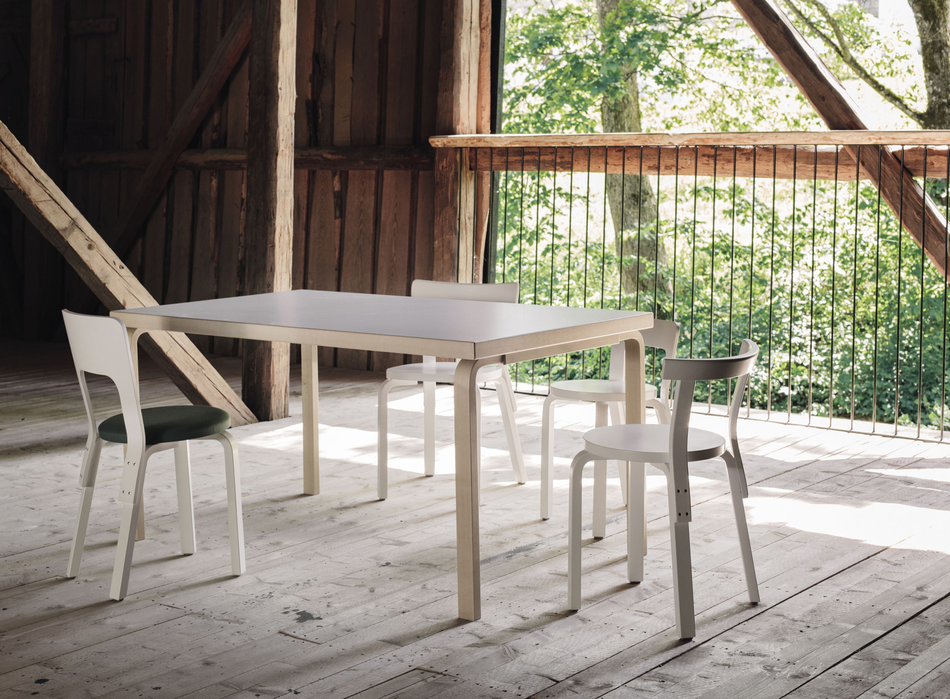 The distinctive circular seat and L-shaped legs are part of Alvar Aalto’s standardized system of components. Available in a variety of colors and finishes.