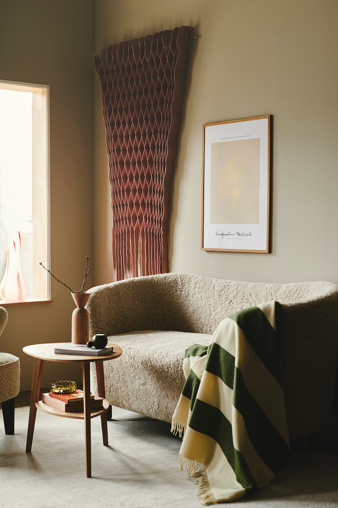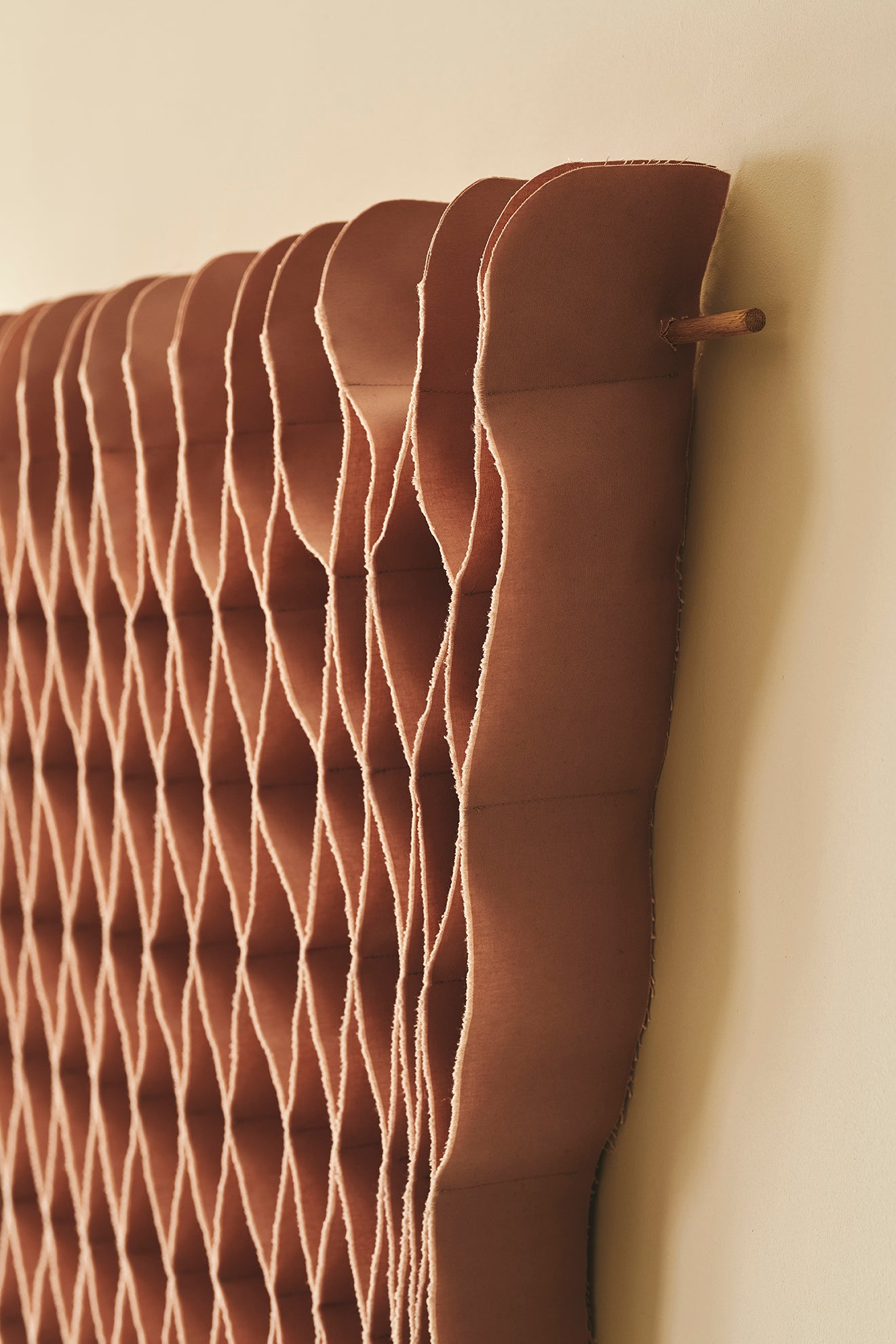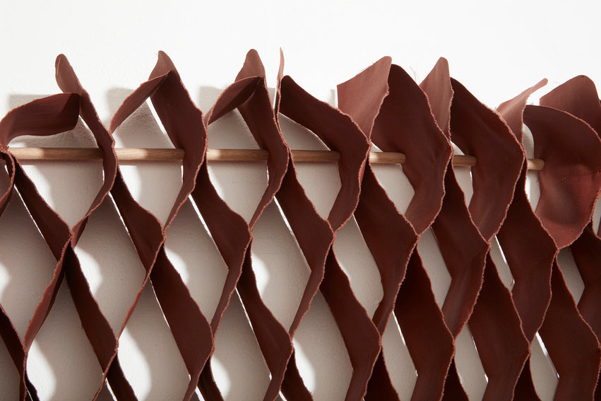 FLOW is a solid-colored flowing, triangular shape. The pieces are made from a selection of durable textiles in carefully curated color palettes. Each one made of 100% cotton and with an oak mount. FLOW is therefore a decorative design that works well as either wall art or as free-hanging decor in a large room or a bright and sunny window display with plenty of daylight.