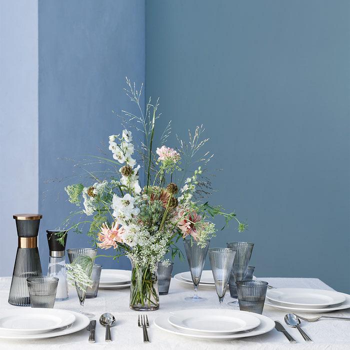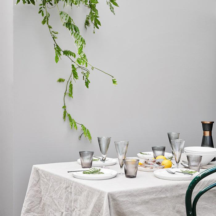 The smoked champagne glasses create an atmosphere of elegance and festivity, and the repeating grooves in the glasses create a minimalist and vibrant expression - along with a refined optical play of color when the light refracts in the glasses. Every single glass is mouth-blown, which means that small, unique differences will occur from glass to glass – a feature of all mouth-blown glass that testifies to the craftsmanship and quality.
