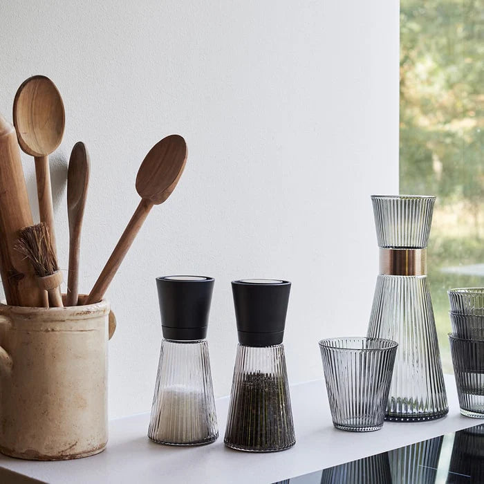 Beautiful, high-quality glass, an elegant, dark grey color, a durable and functional top in black plastic and patinated steel: the Grand Cru Nouveau grinder in Smoke measures 6.7" in height. Great for salt, pepper, or other dried herbs.