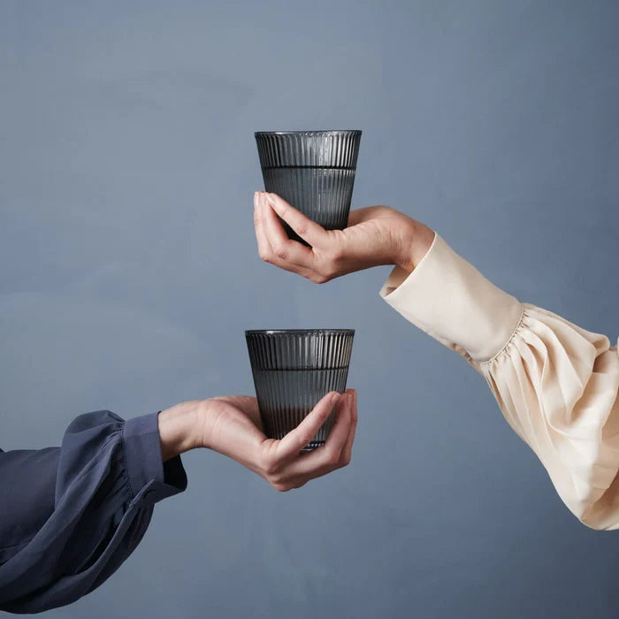 Elegant and functional glasses for everyday use, serve ice-cold refreshing water in the elegant smoke-colored tumblers. Repeating grooves adorn the surface of the glass and create a refined optical play when light is refracted through. An elegant example of functional, stackable glass for modern life. Sold in sets of four.