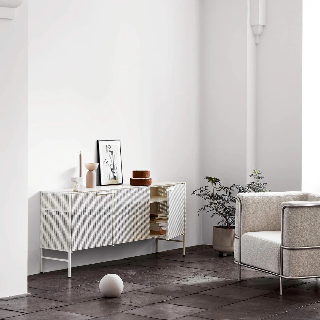 This classic stationery sideboard comes with two perforated steel shelves. The three sideboard doors swing outwards when opened and is closed with a magnetic lock. The top plate of the Grid Sideboard is made of perforated steel, just like The Grid Cabinet. Cupboards alike the Grid Sideboard has been popular for generations due to their ability to store and to store and display any favorite accessories of yours. Used as office furniture the sideboard is a great choice – capable of storing large quantities of your office paperwork and desk utilities. We hope that the popularity of this type of furniture will continue for ages and that the Grid Sideboard will find its way into the modern interior of many new homes.