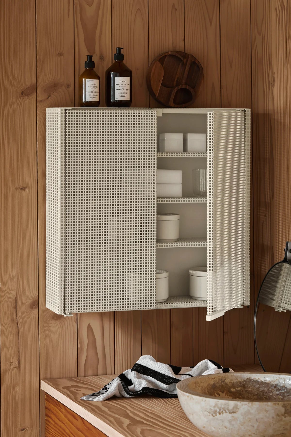 The Grid Wall Cabinet in black is a sophisticated and functional addition to any contemporary space. Made in Europe, this sleek wall-mounted cabinet is crafted from high-quality powder-coated perforated steel. The slim shelves offer practical storage solutions, while the cabinet's black finish lends an air of modern elegance. Its see-through design not only provides a glimpse of the items stored inside but also ensures the cabinet retains a light and airy feel. Perfect for both display and storage, this cabinet enhances any room with its minimalistic yet striking black appearance.
