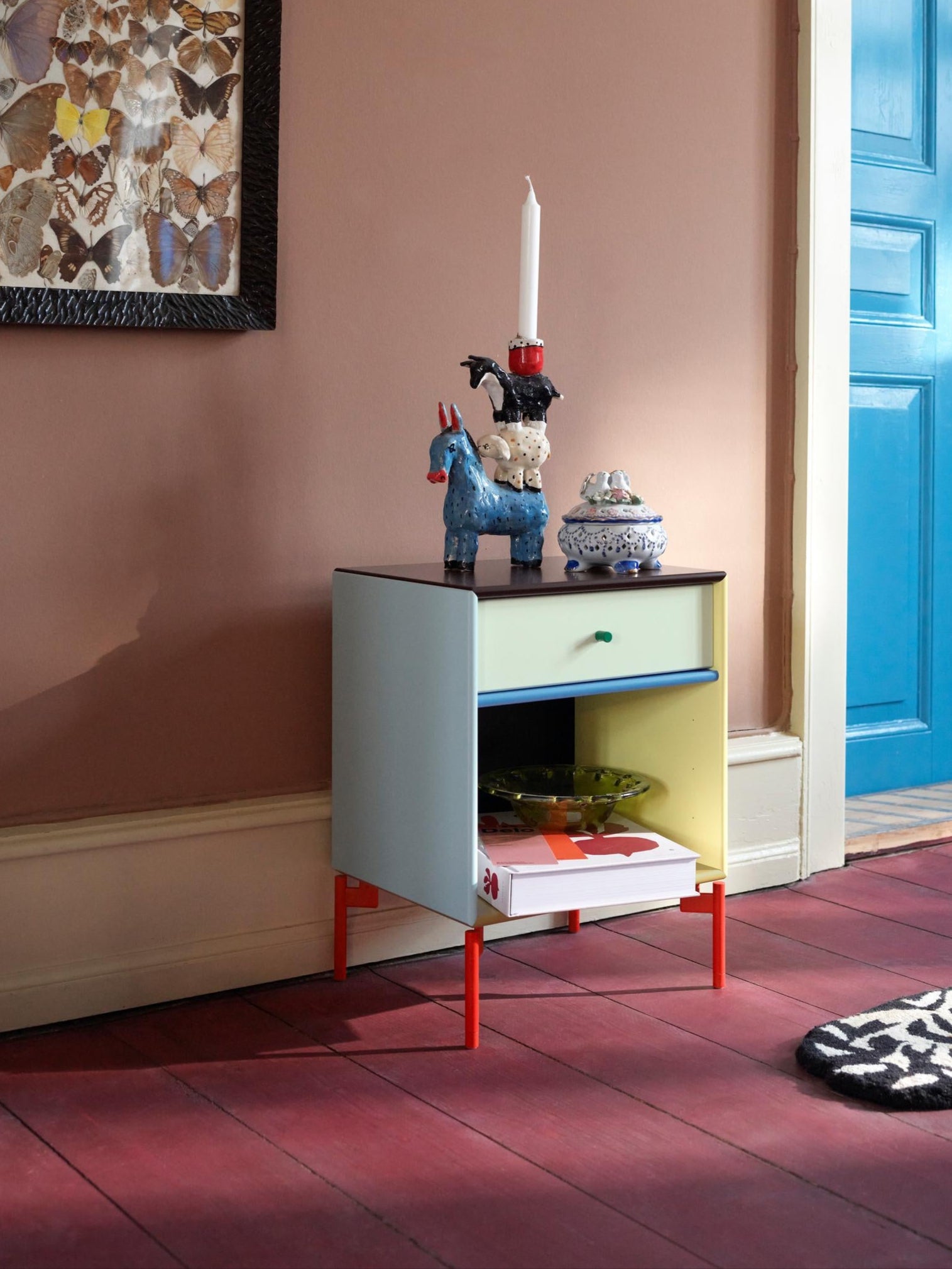 Standing tall on striking red legs, the KIMPOP DREAM bedside table keeps your nighttime essentials close at hand while accompanying you through the night.