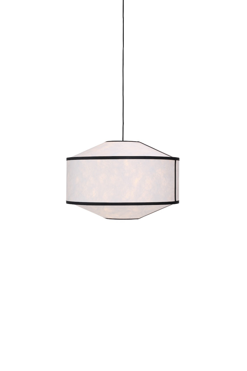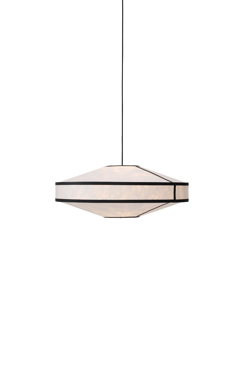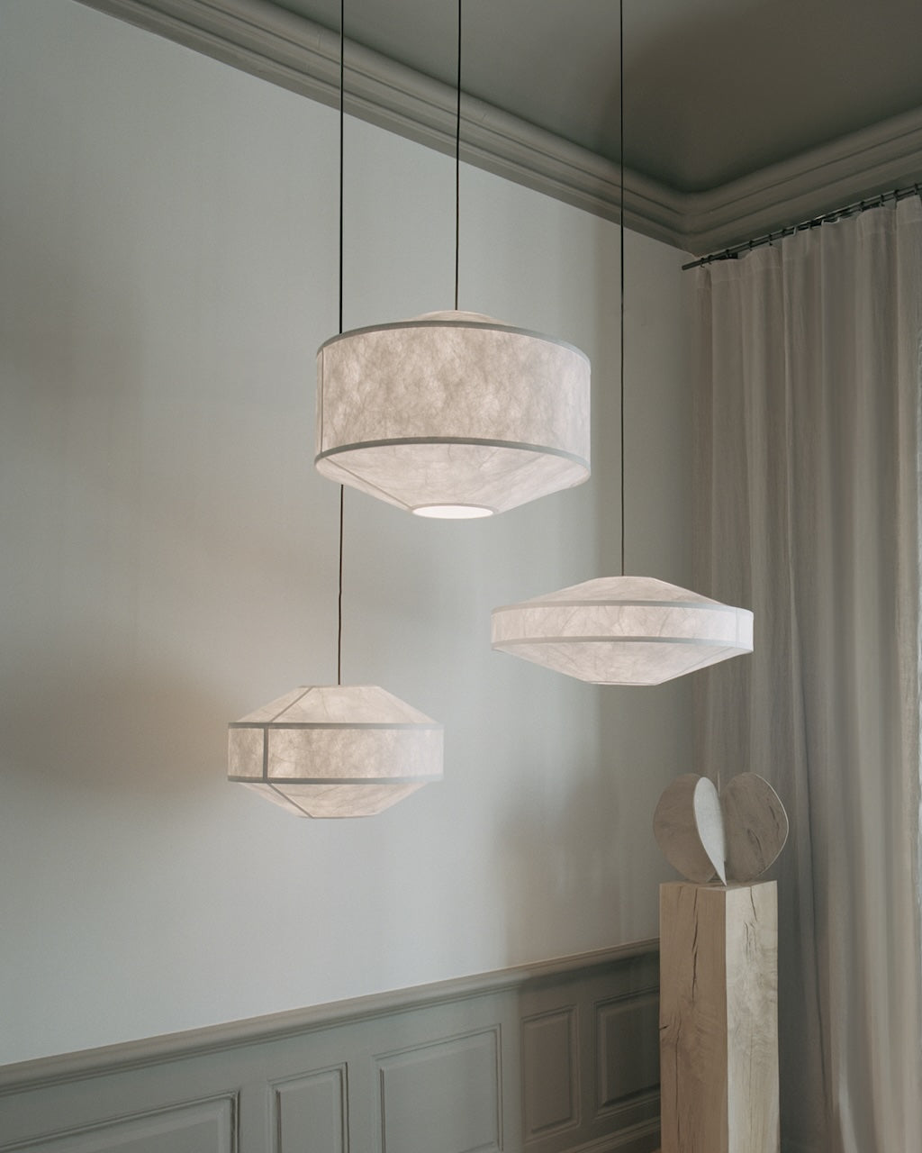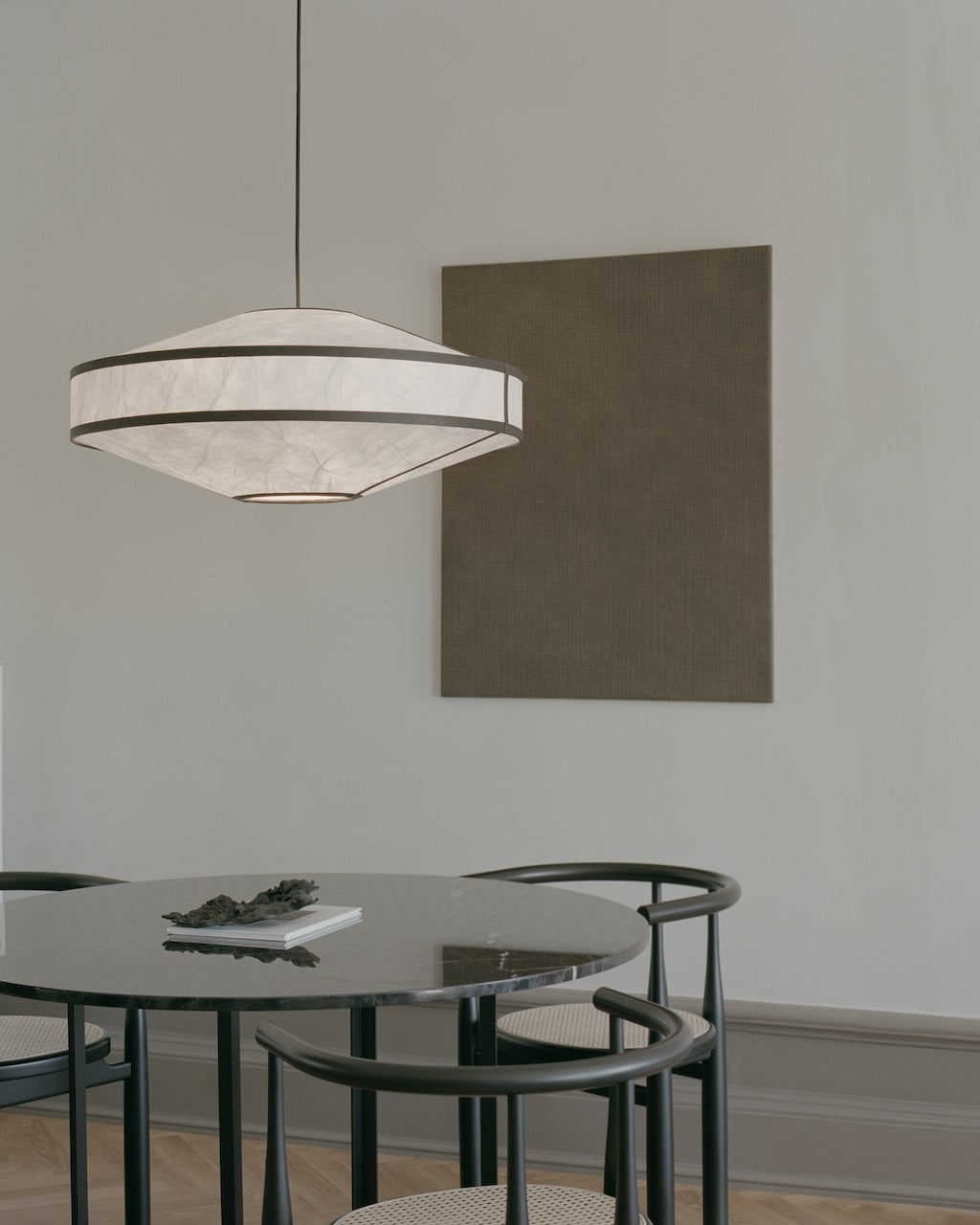 Kite is a work of proportion and abstraction, blending pure and geometric silhouettes with smooth, textured materiality. The same structural elements are adapted into three different sizes, each echoing the other like a tale that alters subtly with each retelling. Delicate taping contours the silhouettes, a technical refinement that enriches depth and contrast. Whether displayed together or separately, the Kite Pendant Lamps serve as a luminous sculptural element.