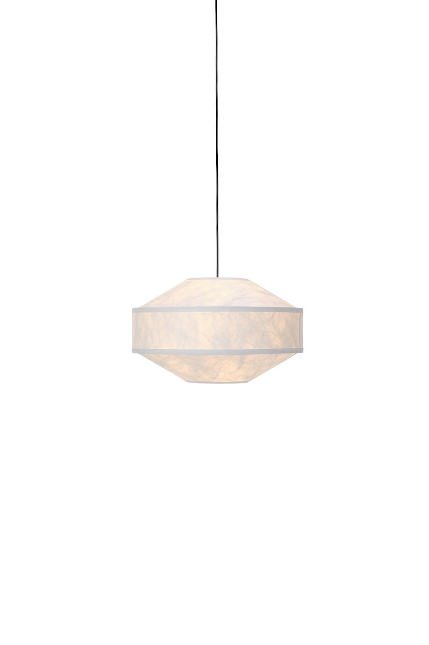 The Kite Pendant Lamps are constructed from folded Tyvek sheets, glued onto polyethylene sheets for added rigidity. The Tyvek lampshade is suspended from a cast metal fitting.