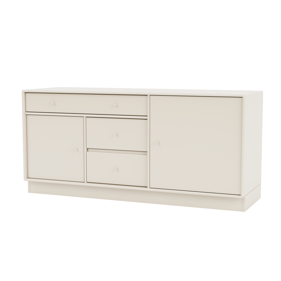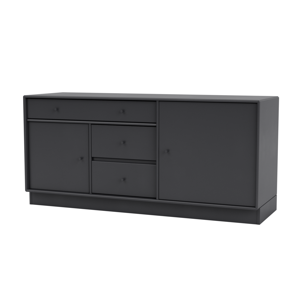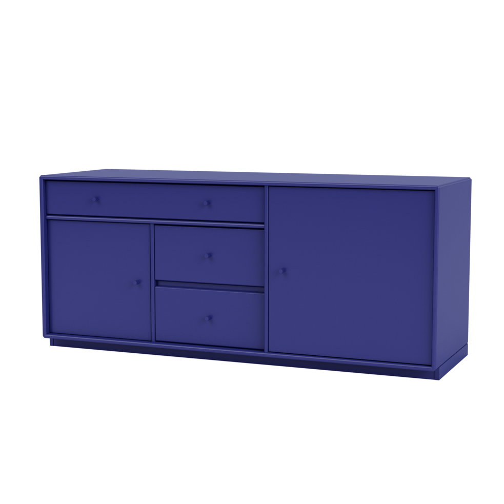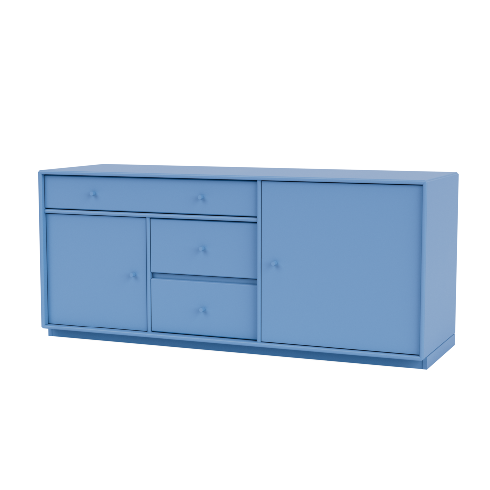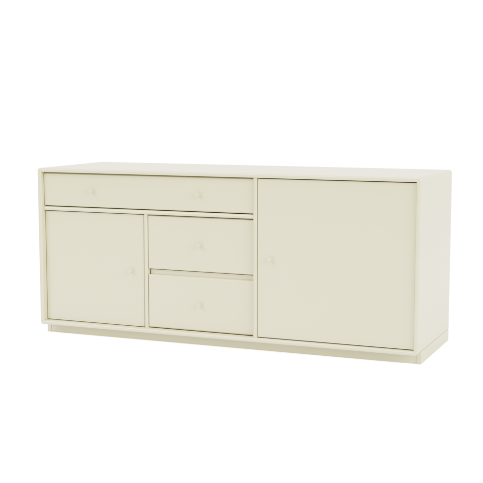This low board from the Montana Mega series gives you three spacious drawers and two compartments with doors. The closed compartments along with the drawers make this piece of furniture perfect for keeping your space clutter-free. The asymmetric arrangement of the doors and drawers adds a charming playfulness. This storage solution works equally well in in the living room, the kitchen, or the entrance hall.