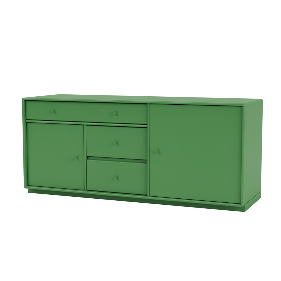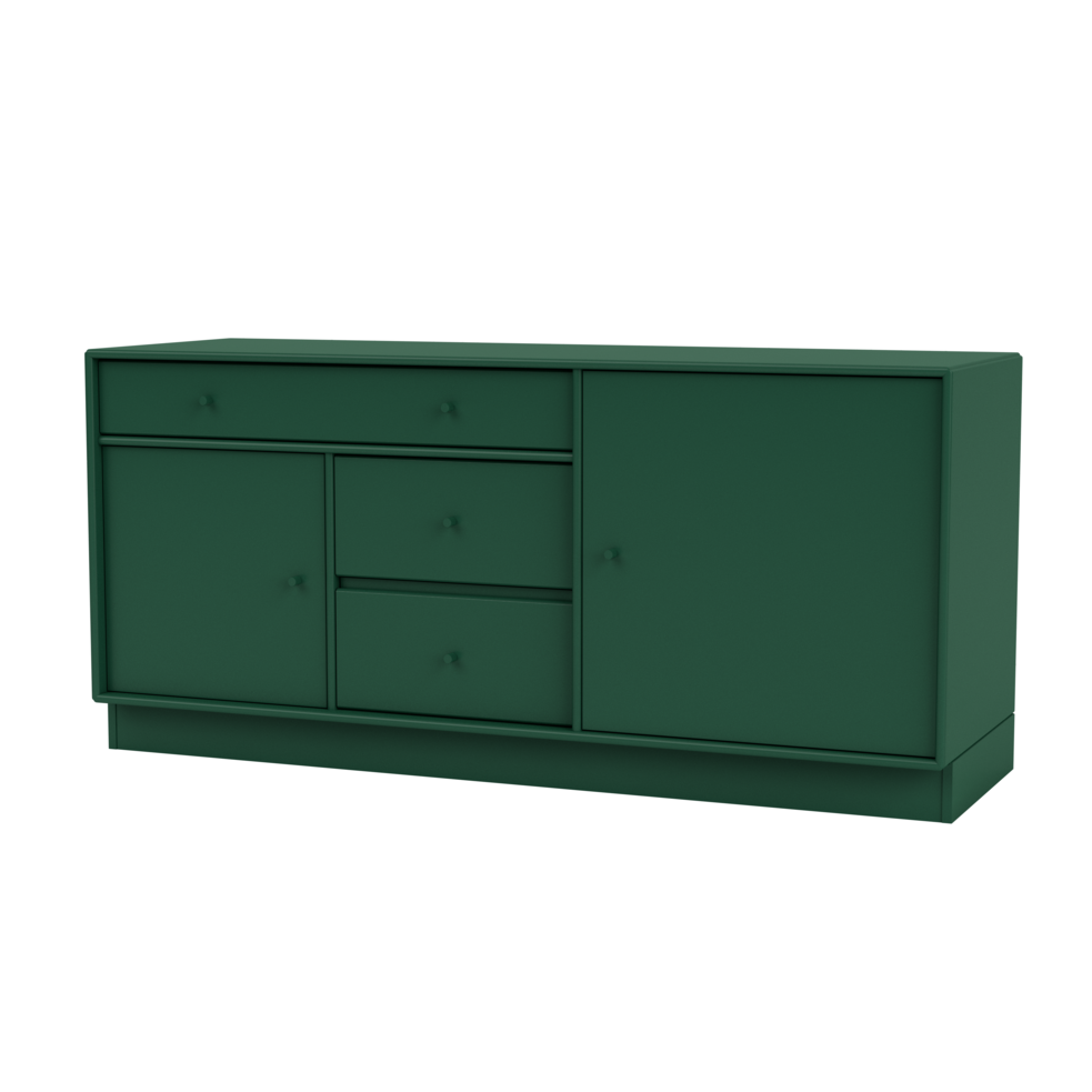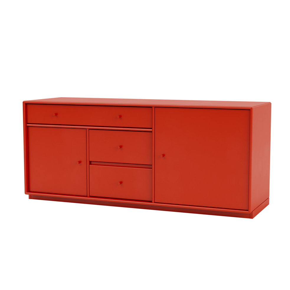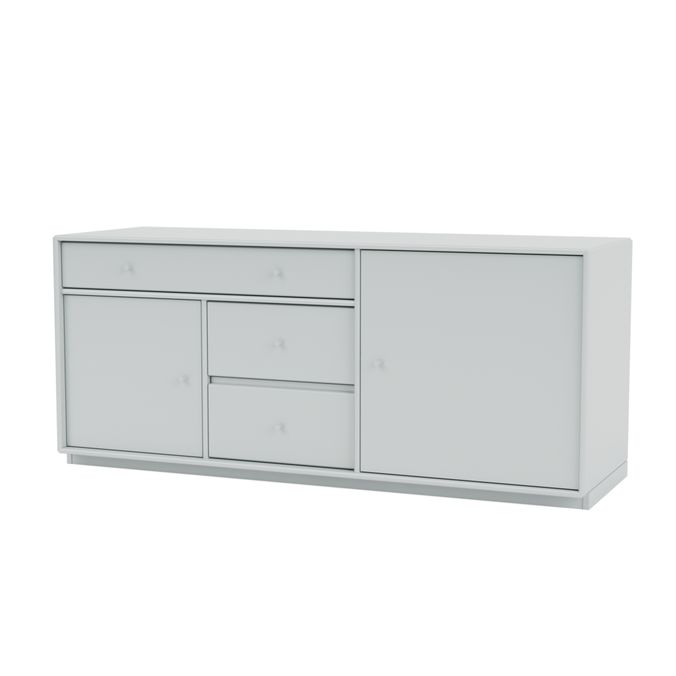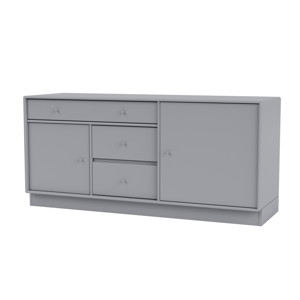 This low board from the Montana Mega series gives you three spacious drawers and two compartments with doors. The closed compartments along with the drawers make this piece of furniture perfect for keeping your space clutter-free. The asymmetric arrangement of the doors and drawers adds a charming playfulness. This storage solution works equally well in in the living room, the kitchen, or the entrance hall.