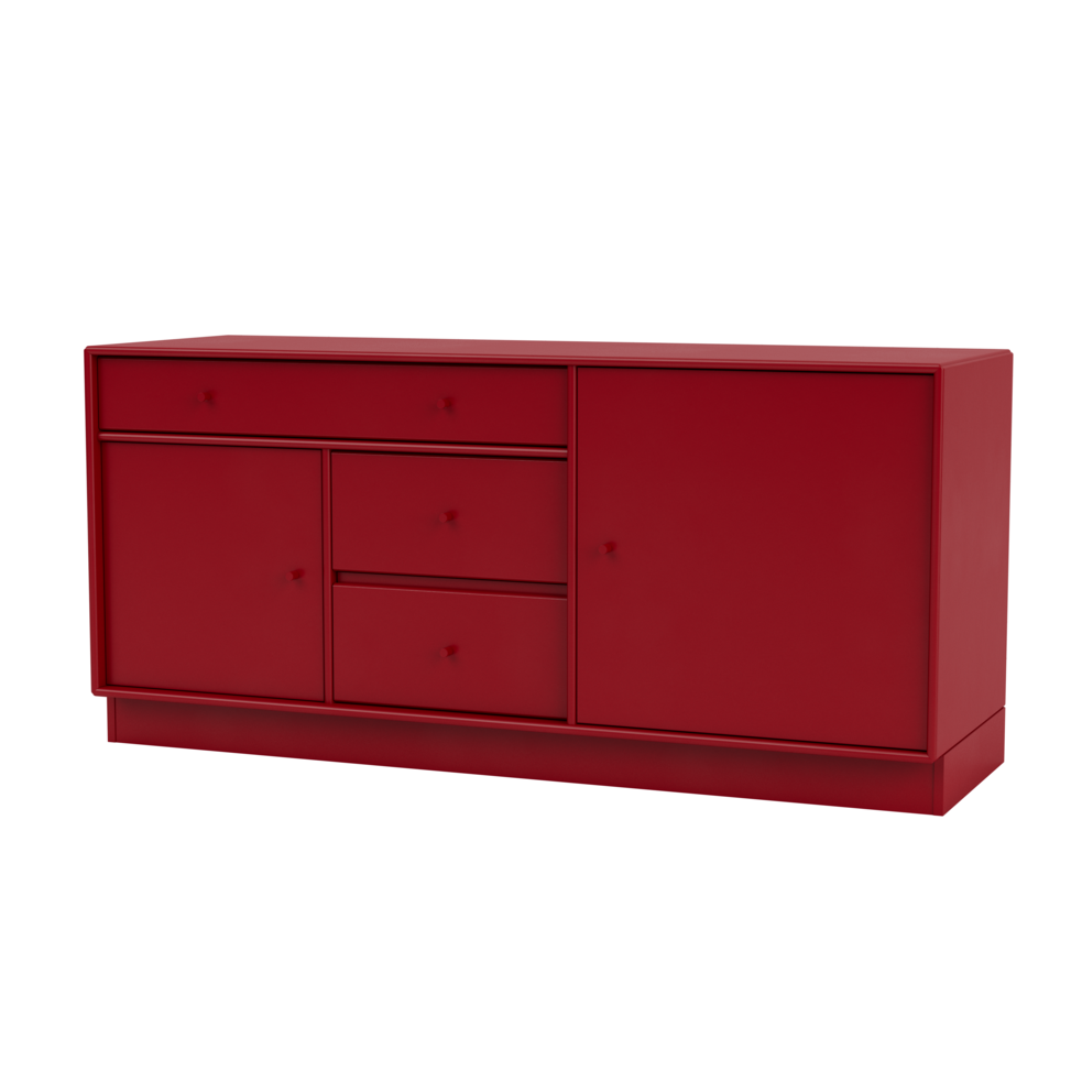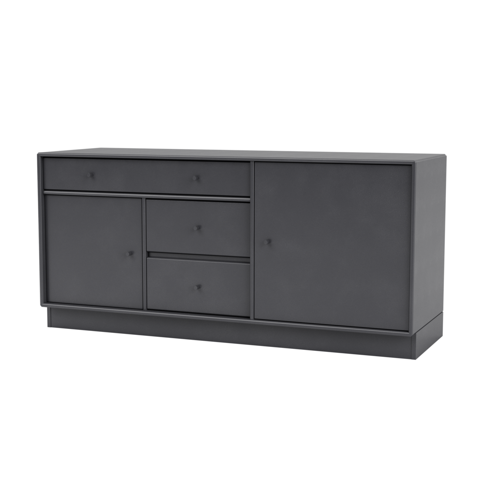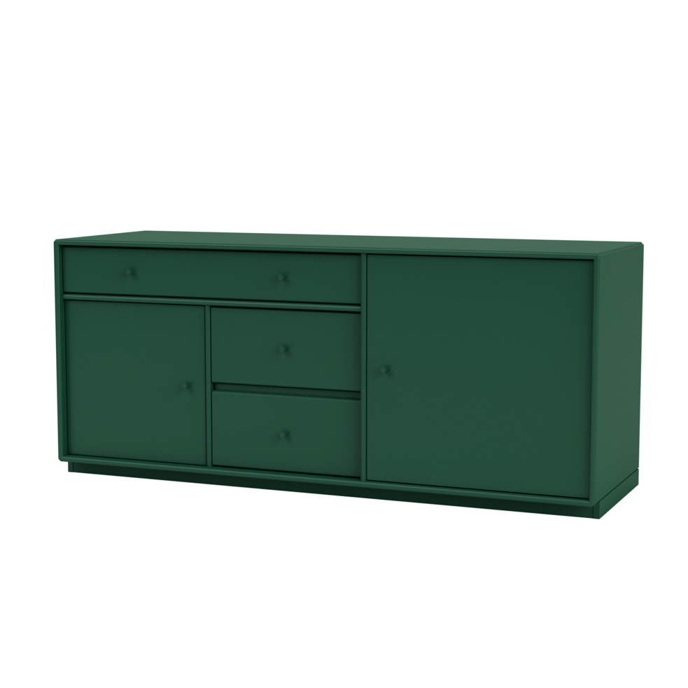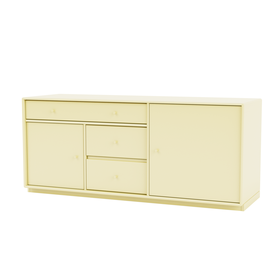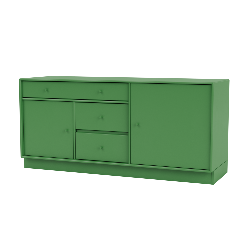 This low board from the Montana Mega series gives you three spacious drawers and two compartments with doors. The closed compartments along with the drawers make this piece of furniture perfect for keeping your space clutter-free. The asymmetric arrangement of the doors and drawers adds a charming playfulness. This storage solution works equally well in in the living room, the kitchen, or the entrance hall.