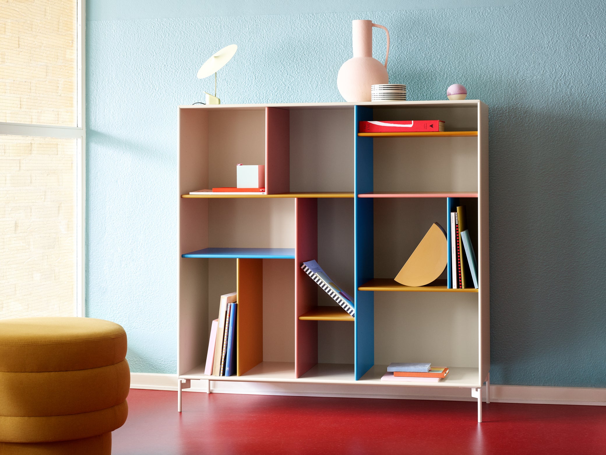 A high board with a modern expression from the Montana Mega series. Display shelf with 13 open compartments. The asymmetric design and the varying shapes and sizes of the different sections can be styled in multiple ways. Fill it with a collection of magazines, your favorite books, a few green plants, and a bouquet of flowers. No matter how you choose to use the storage space it will be a display out of the ordinary.