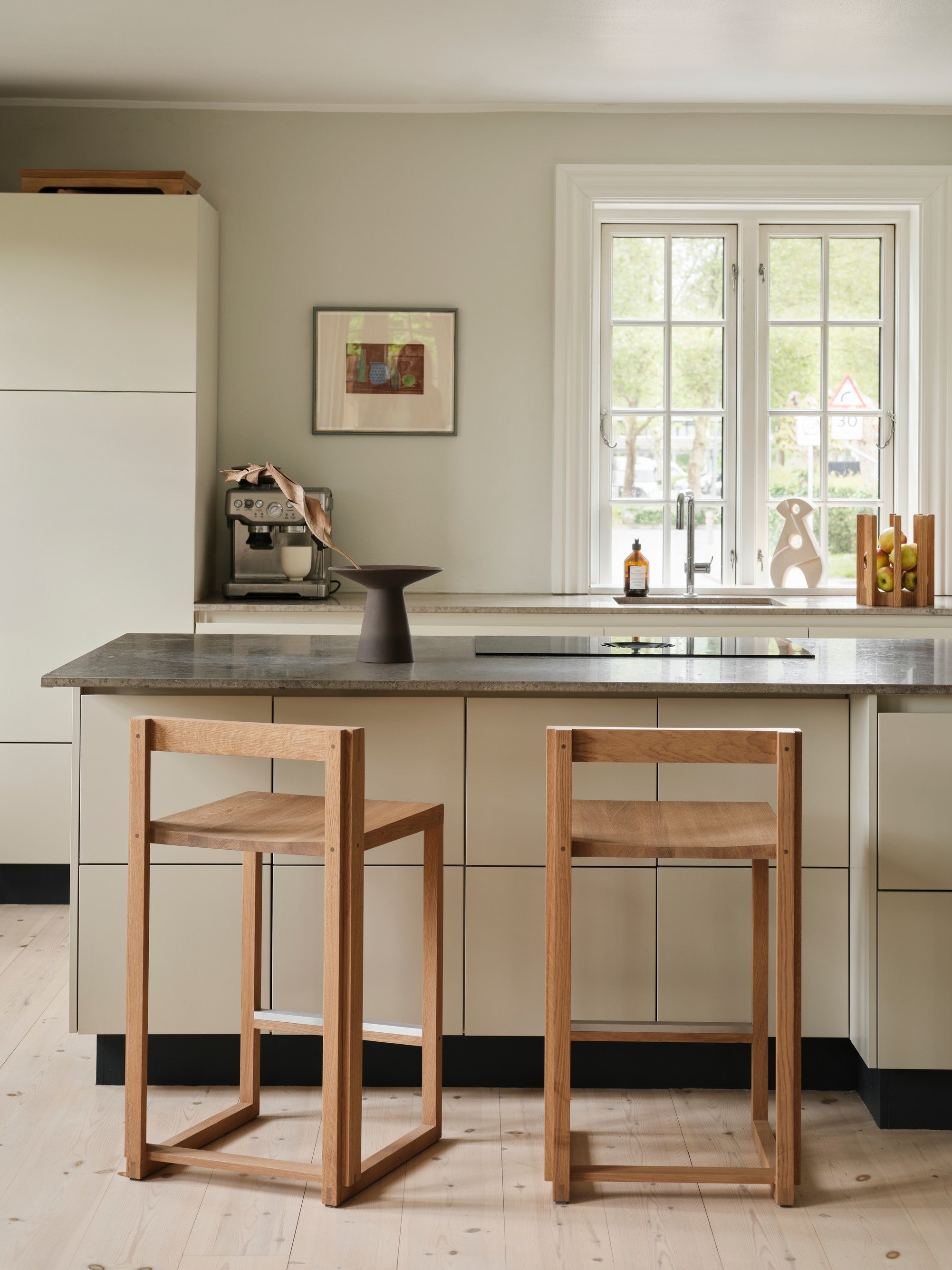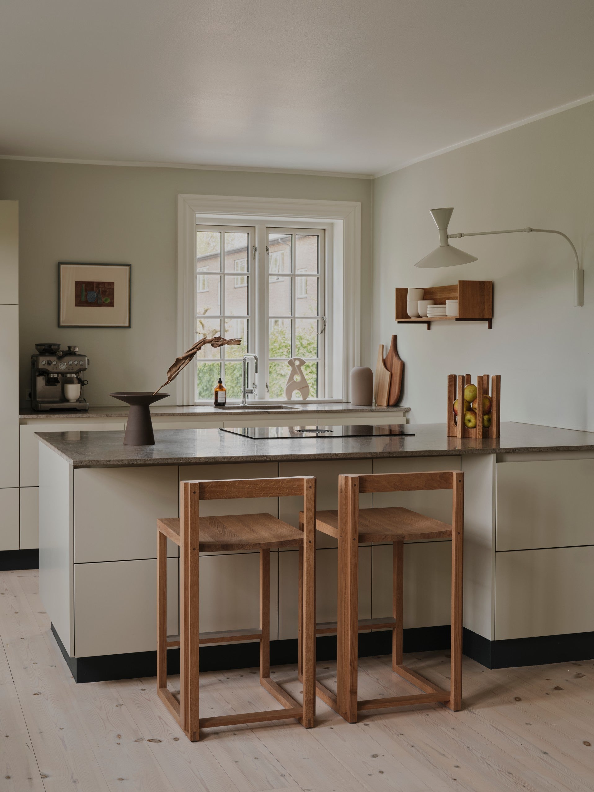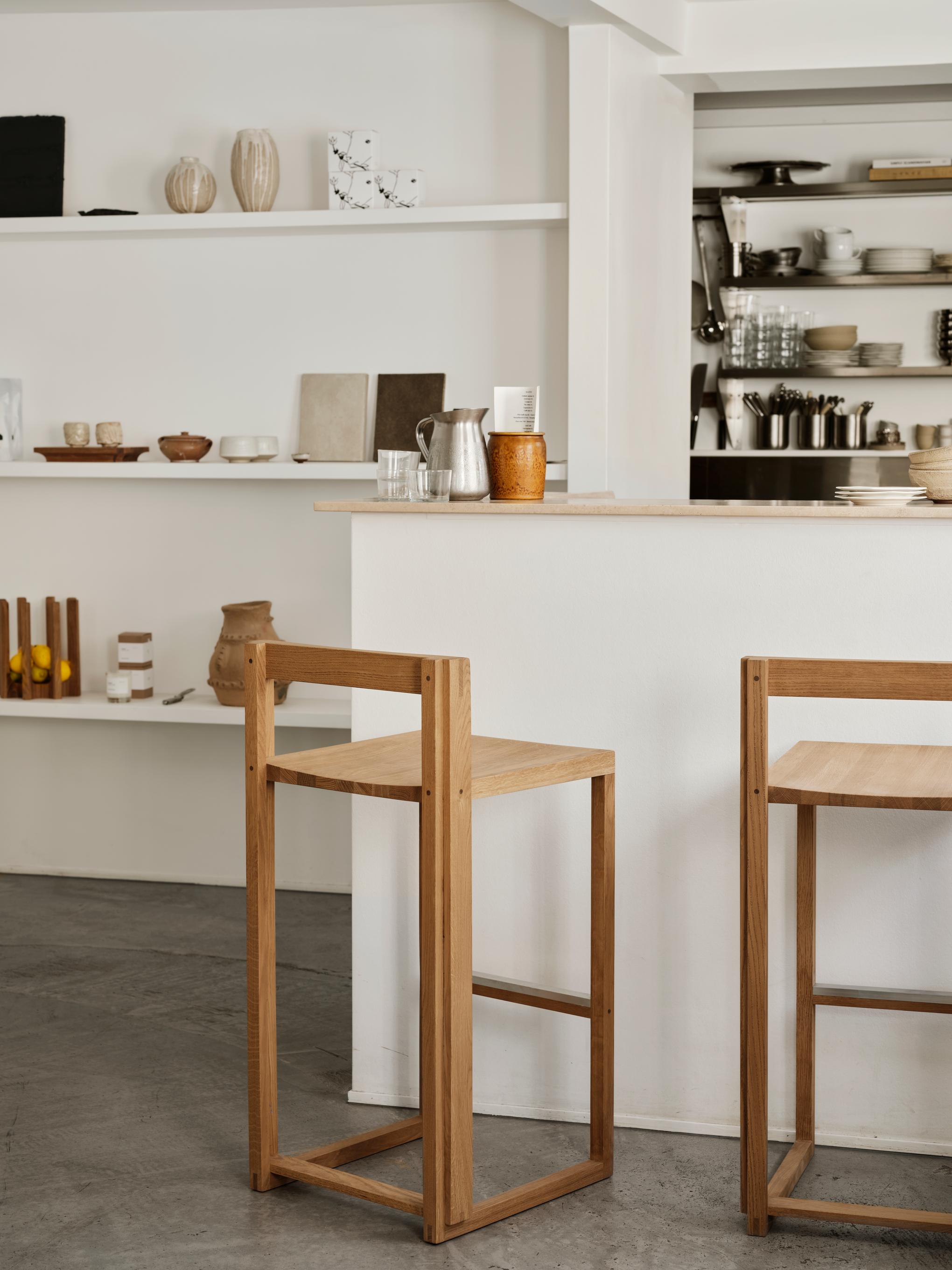 The Outline Stool has a minimalist, airy aesthetic, allowing it to fit easily into any interior design style. The interplay of wooden rectangles creates the visual harmony that is key to Kristina Dam Studio’s ethos of “sculptural minimalism.” Made from lacquered oak with walnut details and a brushed aluminum footrest, making it a long-lasting design.