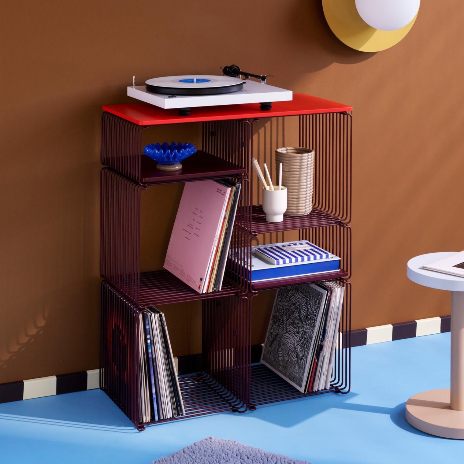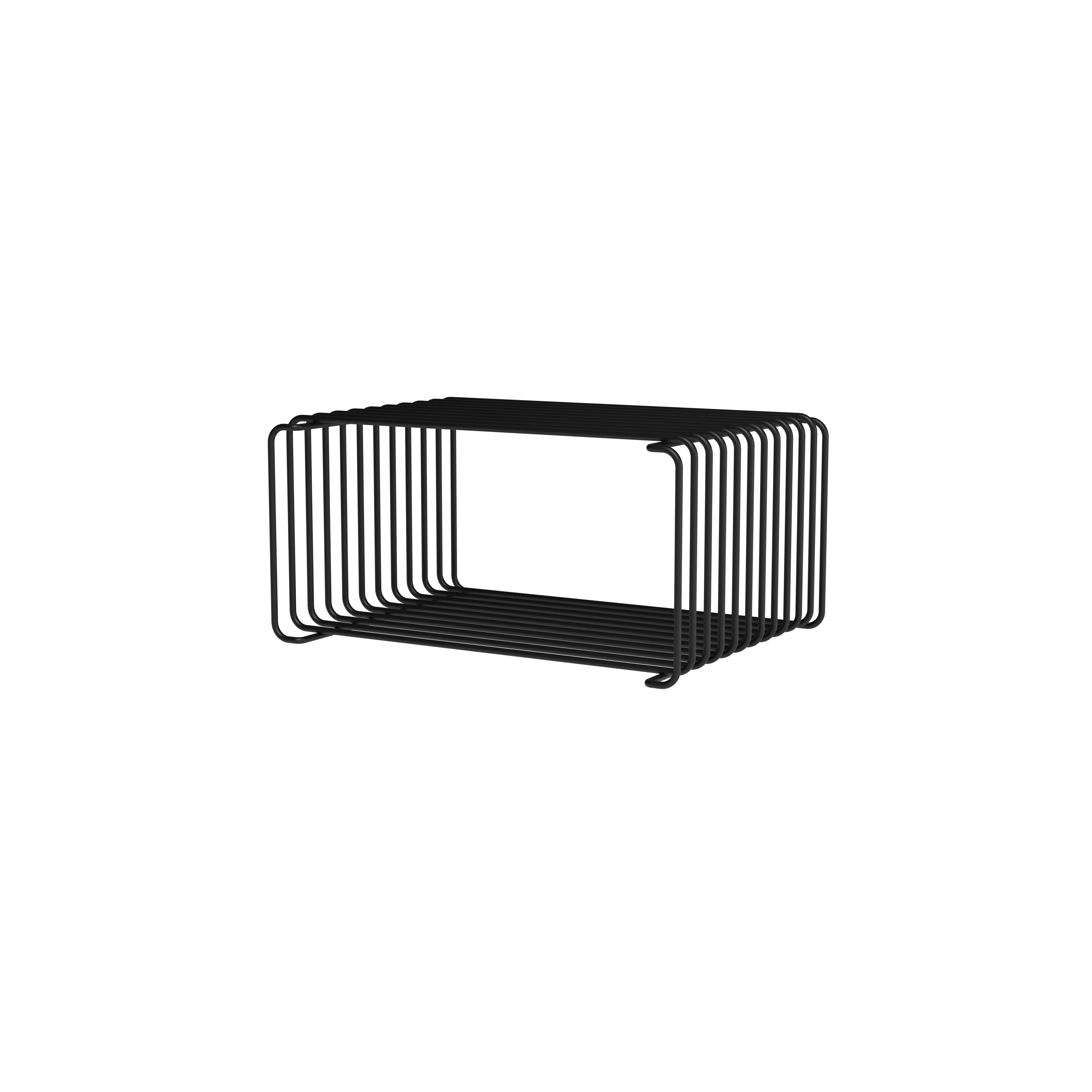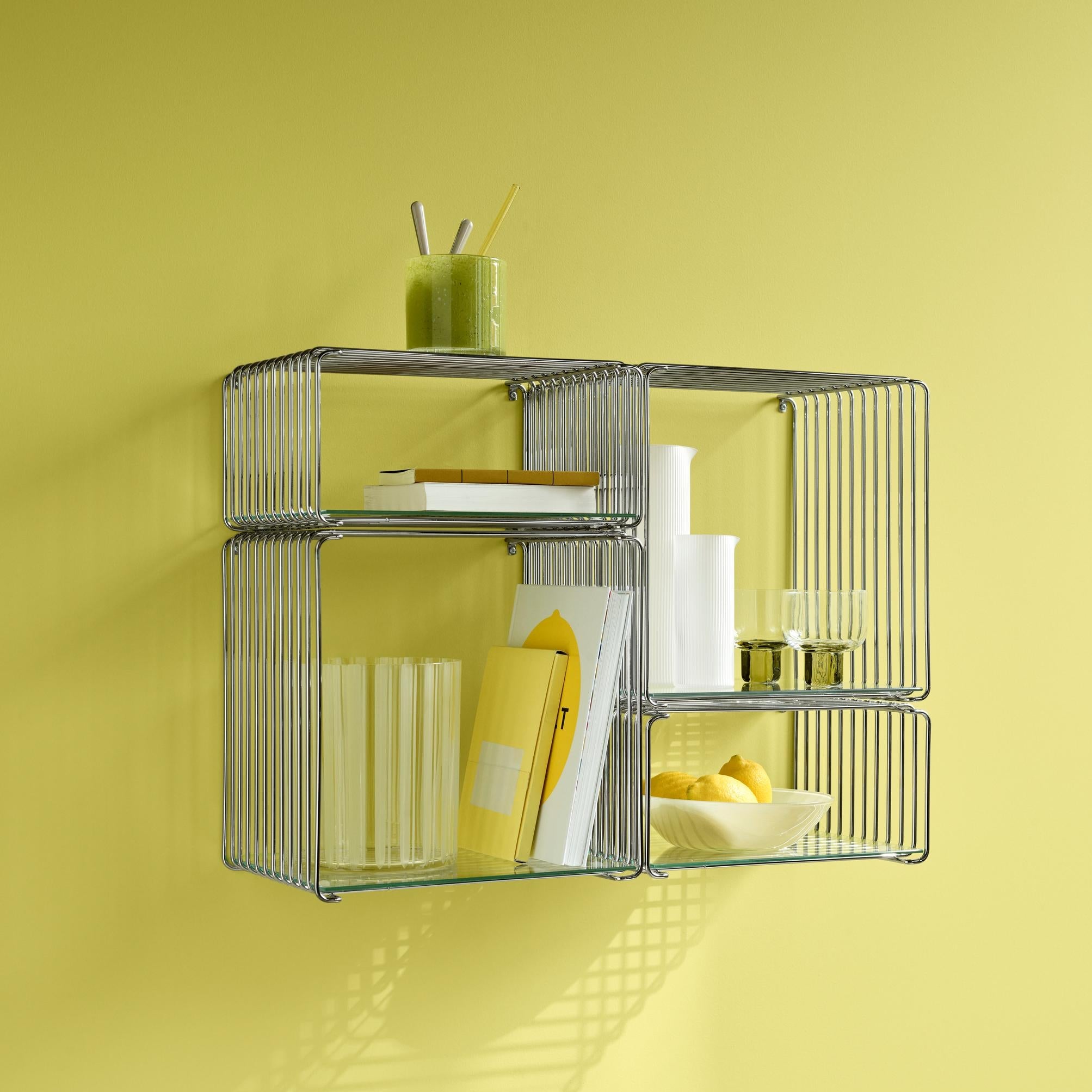 Available in 10.1 in and 13.7 in depths and finishes including Chrome, Black, Snow, Pine, Monarch, Black Red, and Rosehip. Use it on the floor, wall, or as a room divider. Pair with other Panton Wire modules, top plates, or insert shelves for a personalized look.