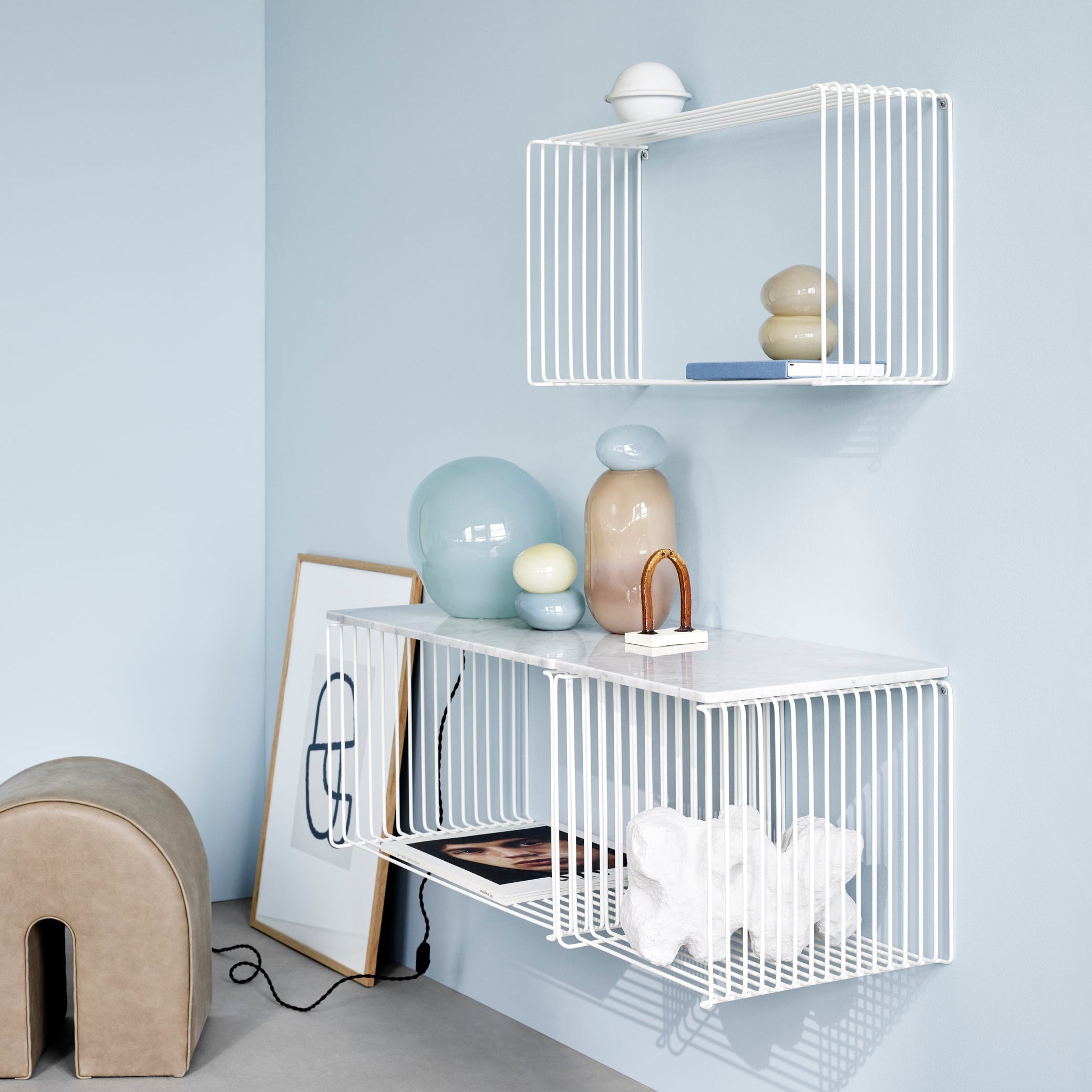 Add the single or double top panel to the Panton Wire unit and create a surface to use the shelf as a table. This size is, for example, perfect as a bedside table or side table by the sofa – standing on the floor or hanging on the wall.