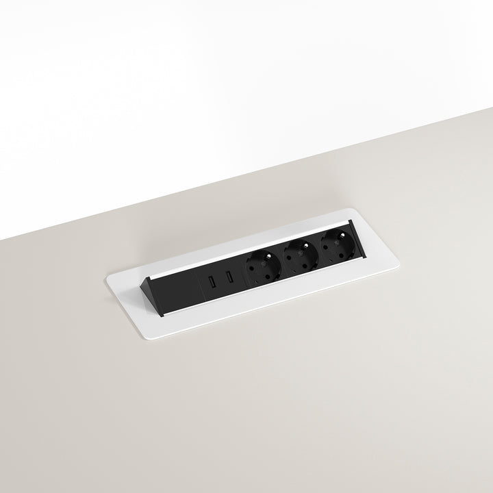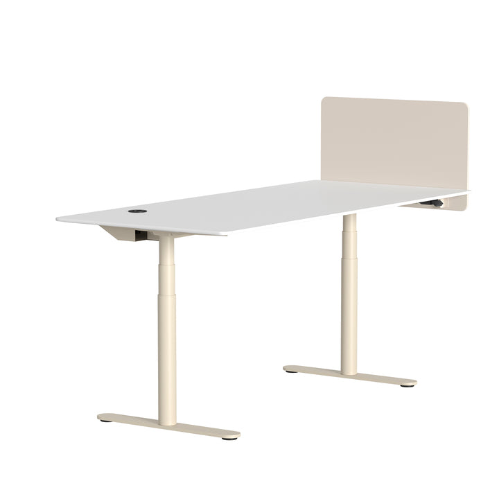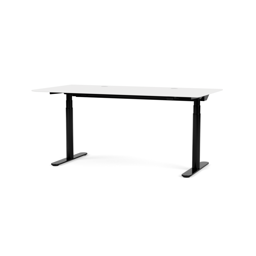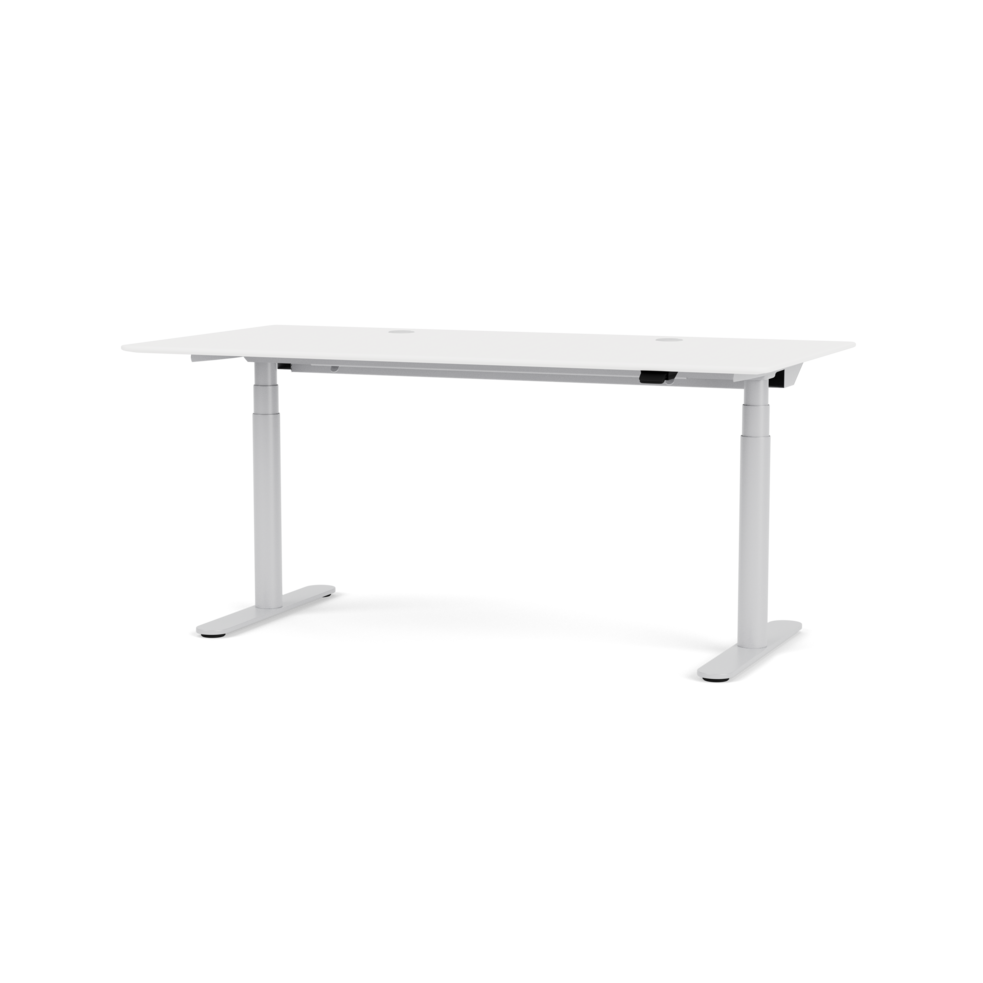 This rectangular height-adjustable work desk is ideal for both private and professional use for both seated and standing work. The desk's tabletop is made of micro laminate in the color Snow and the frame is available in Aluminum, Black, and Snow.