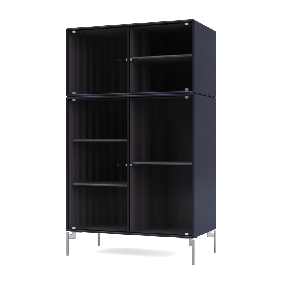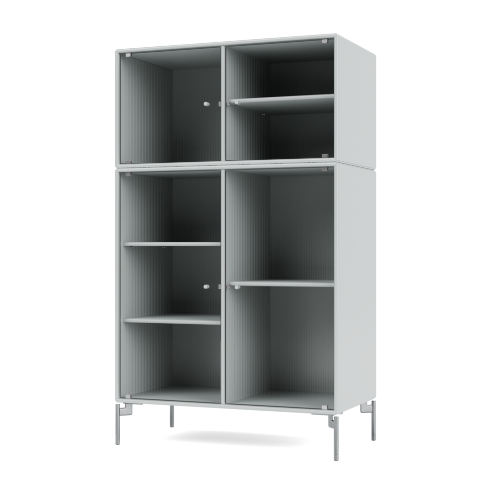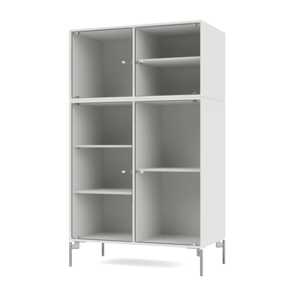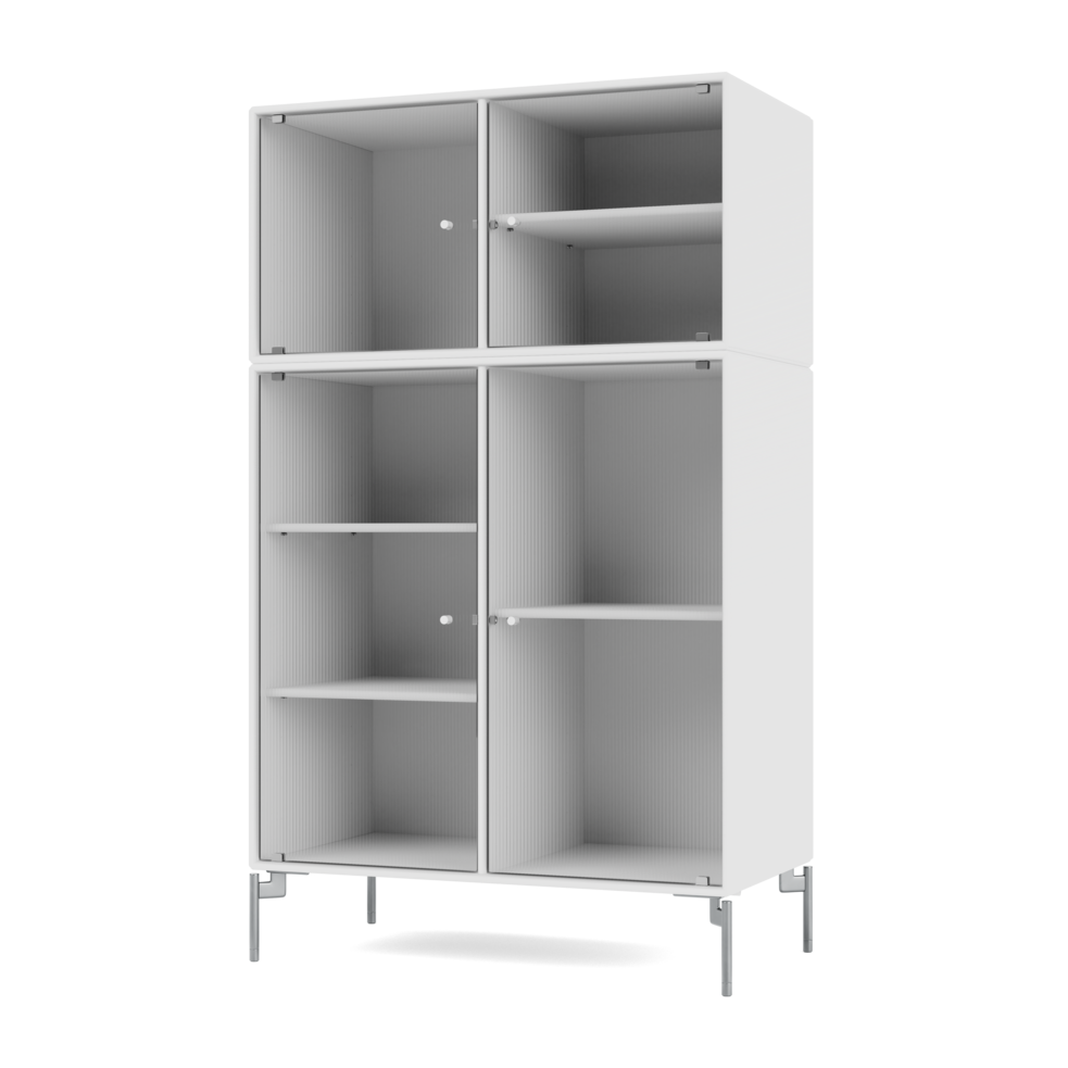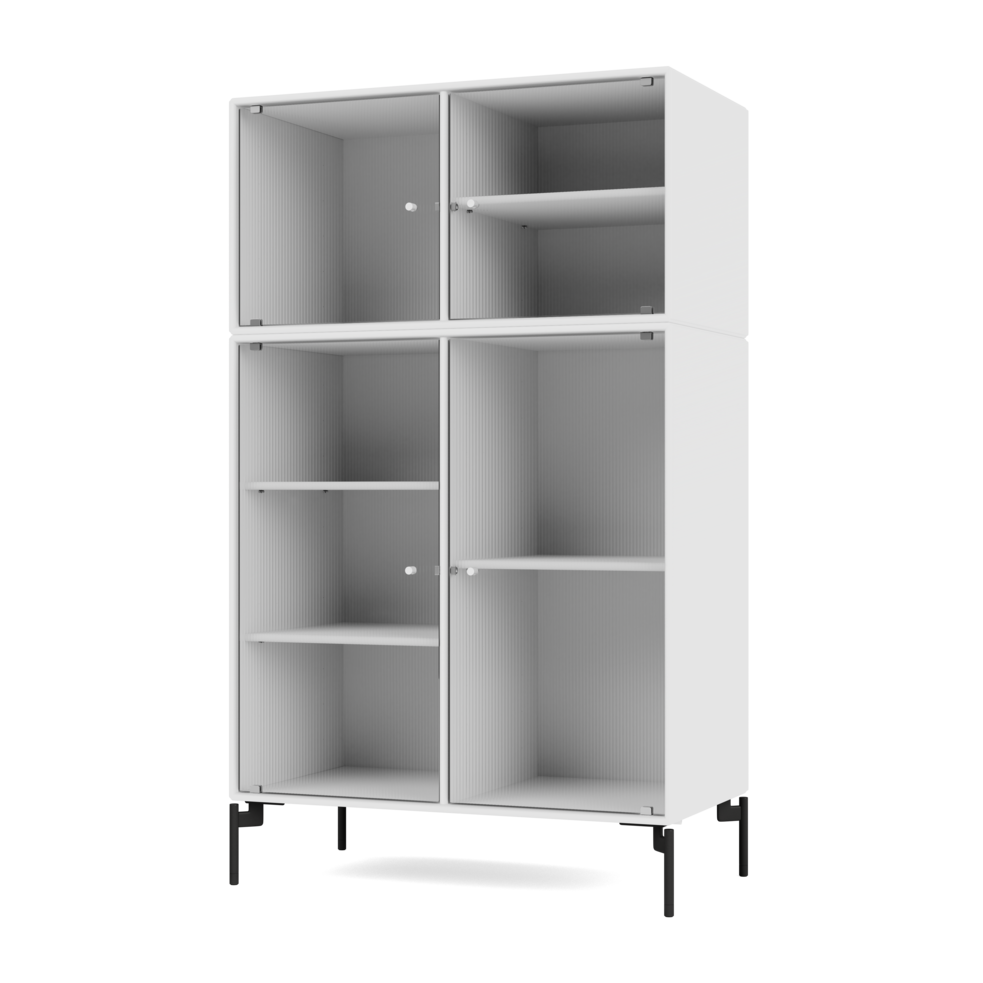 RIPPLE III is a medium-sized vitrine with 4 doors in rippled glass. It is available with legs, plinth, or suspension rails for mounting on a wall. The cabinet can be used as a high-board in the living room or for displaying tableware in the kitchen or dining area. The height makes the top of the cabinet an ideal display surface for lamps, vases, and other decorative items.