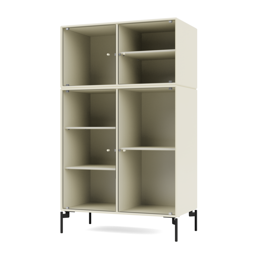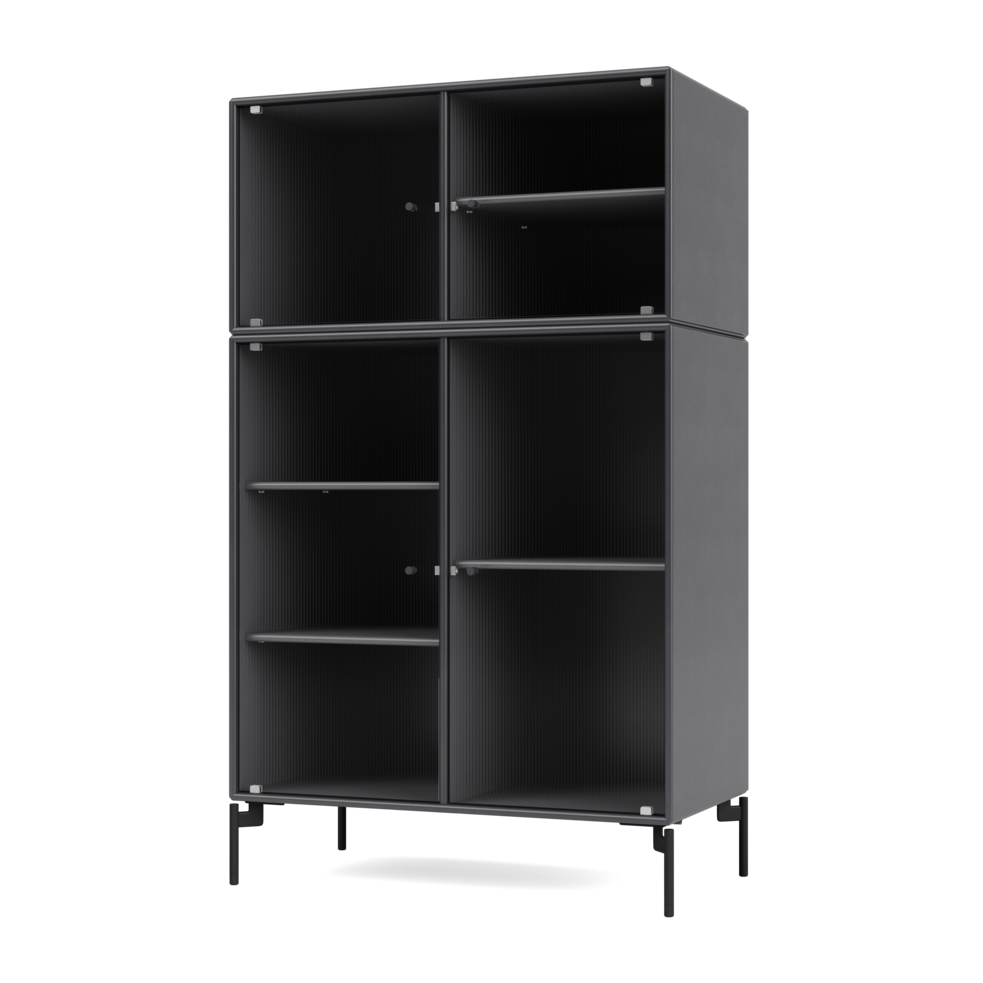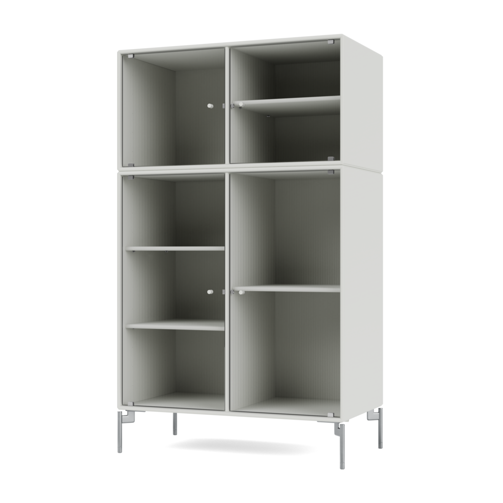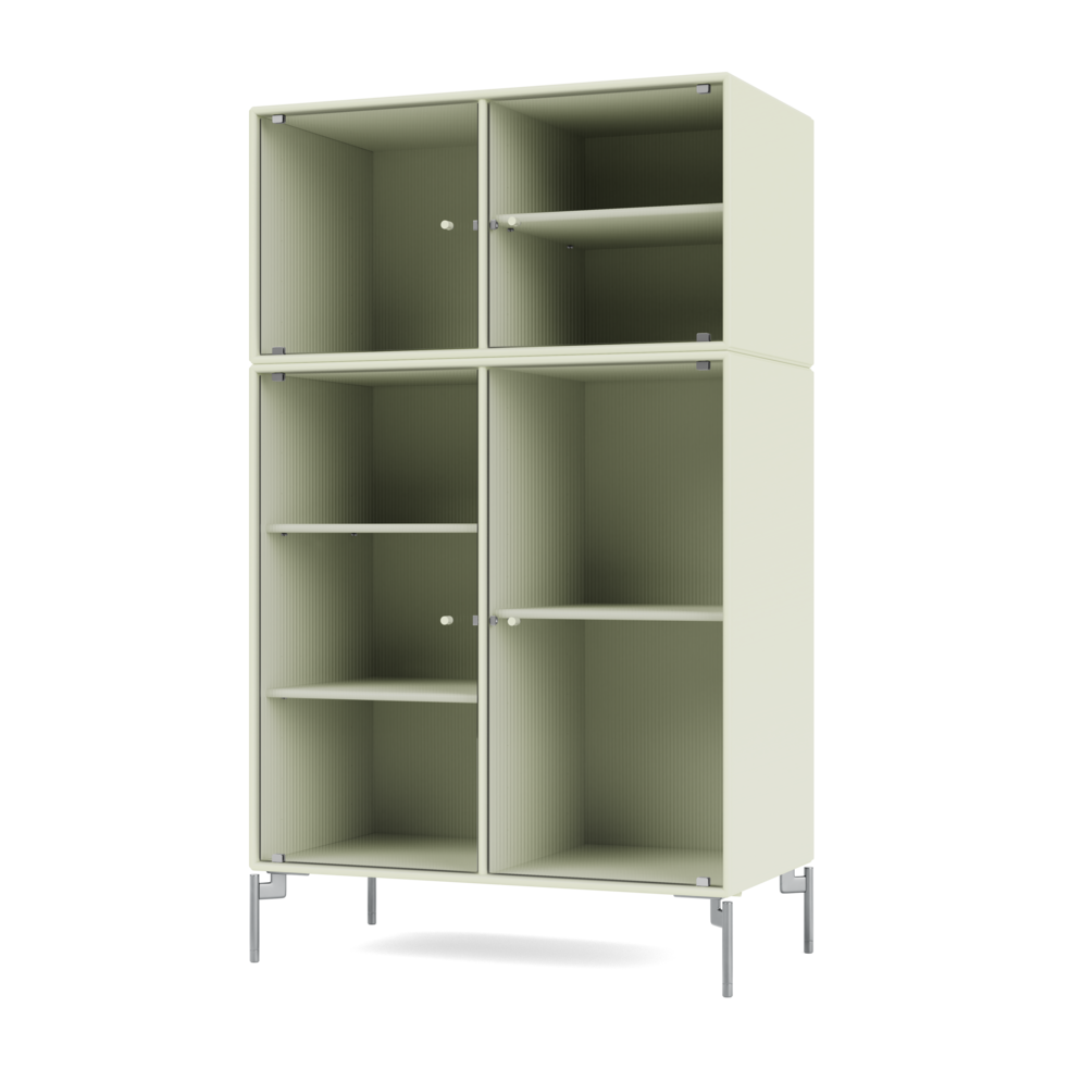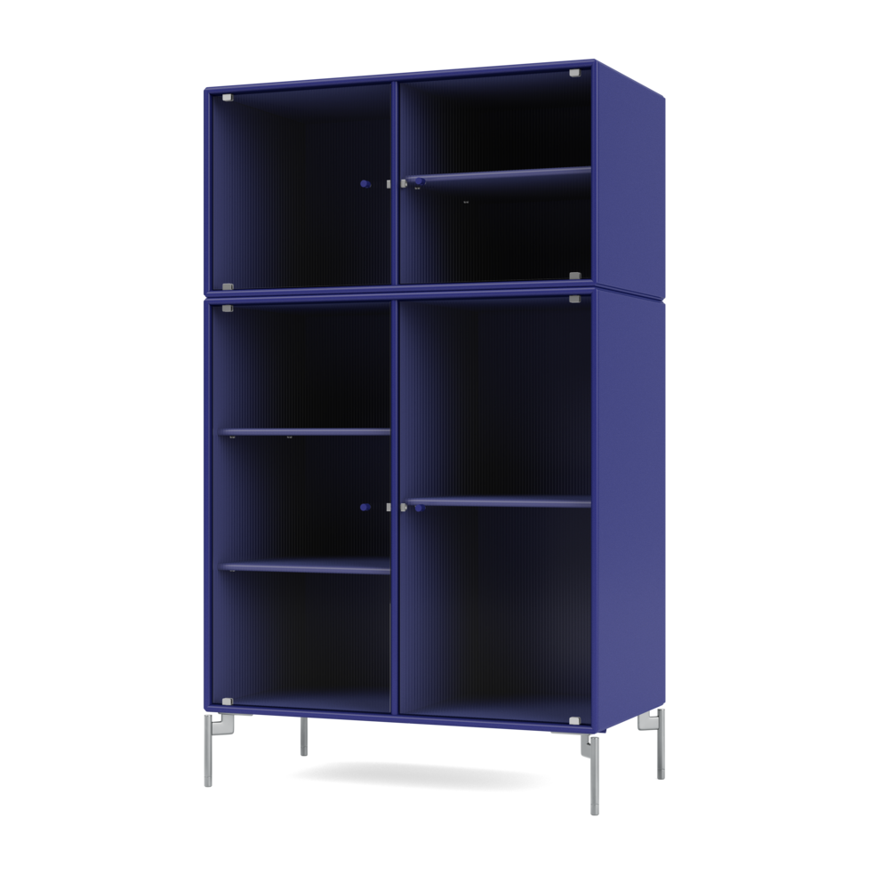 RIPPLE III is a medium-sized vitrine with 4 doors in rippled glass. It is available with legs, plinth, or suspension rails for mounting on a wall. The cabinet can be used as a high-board in the living room or for displaying tableware in the kitchen or dining area. The height makes the top of the cabinet an ideal display surface for lamps, vases, and other decorative items.