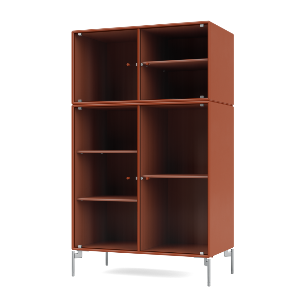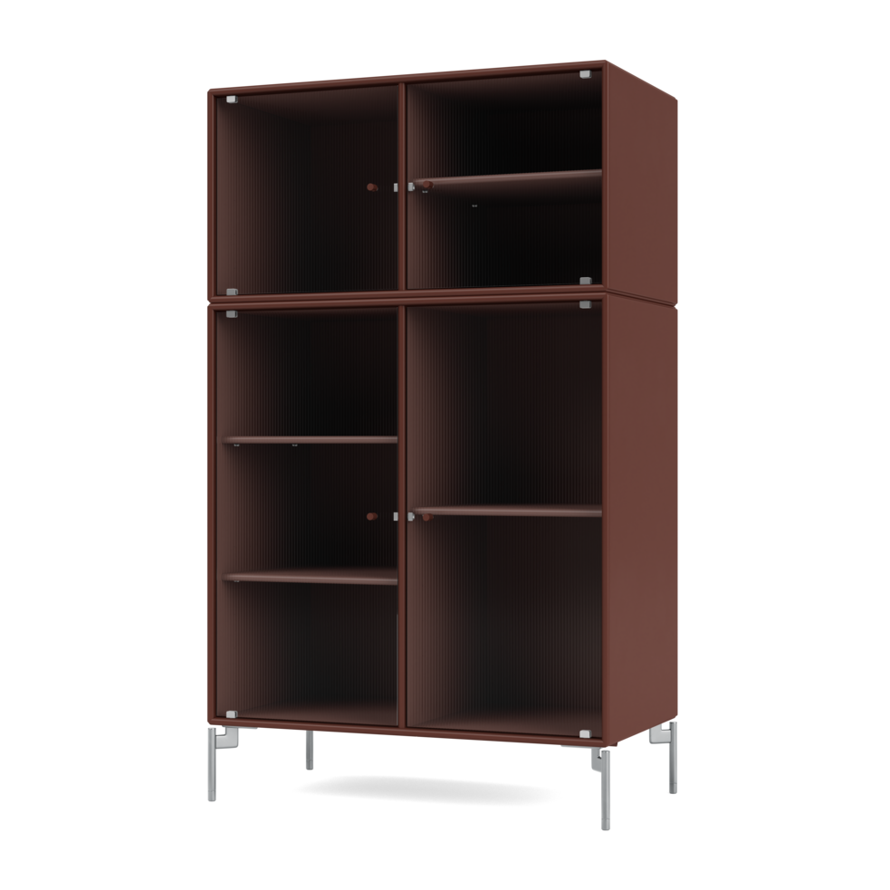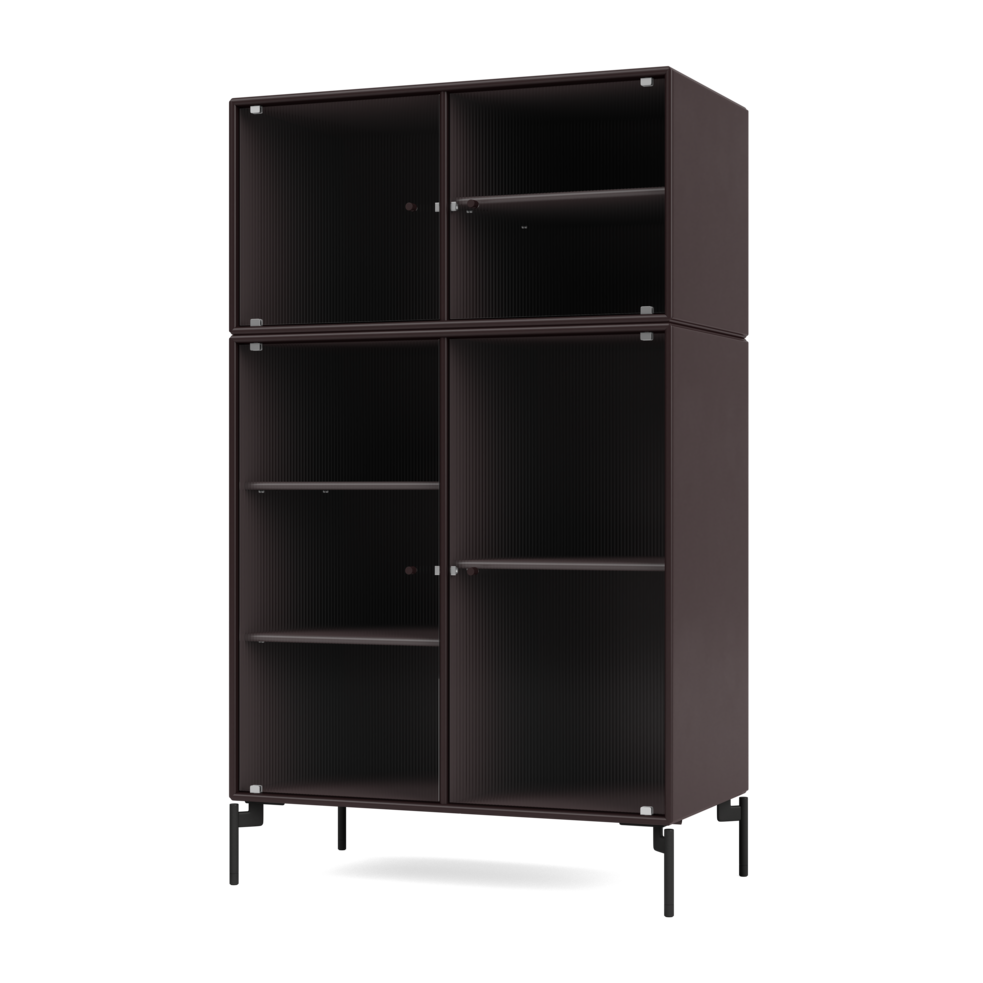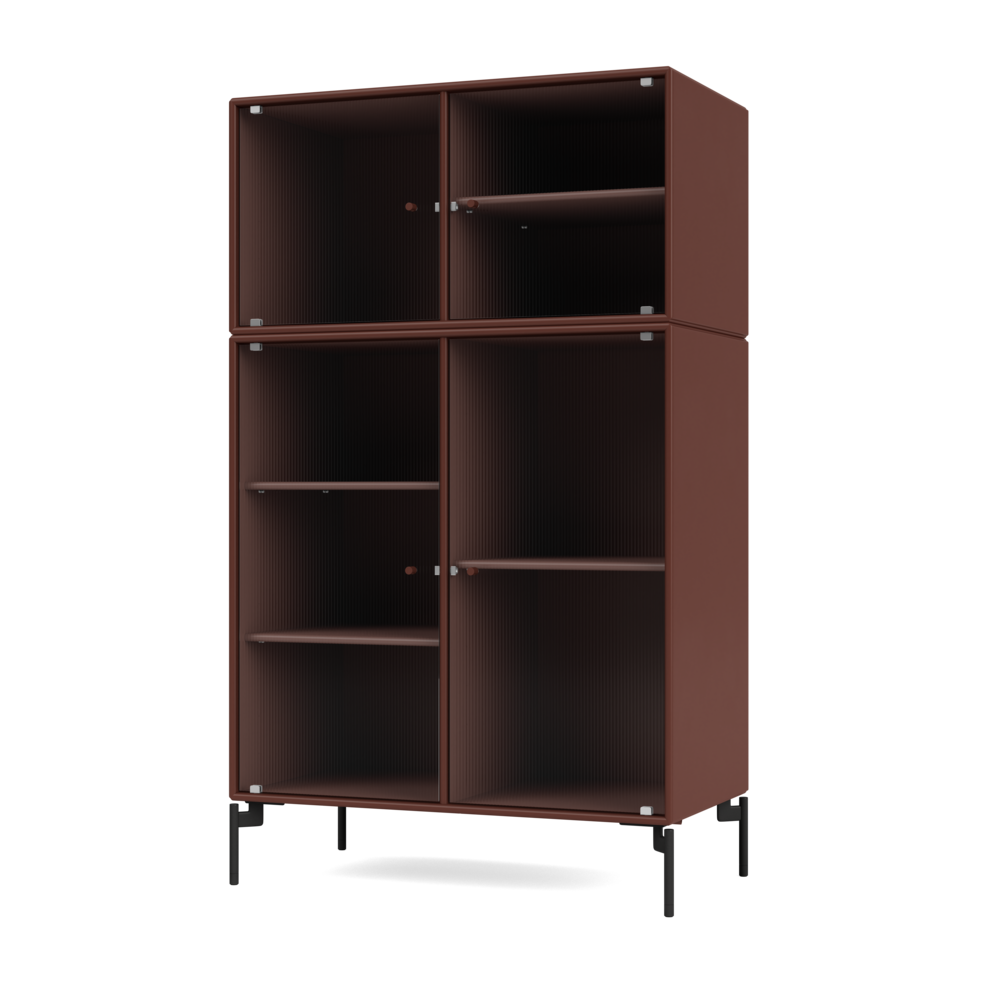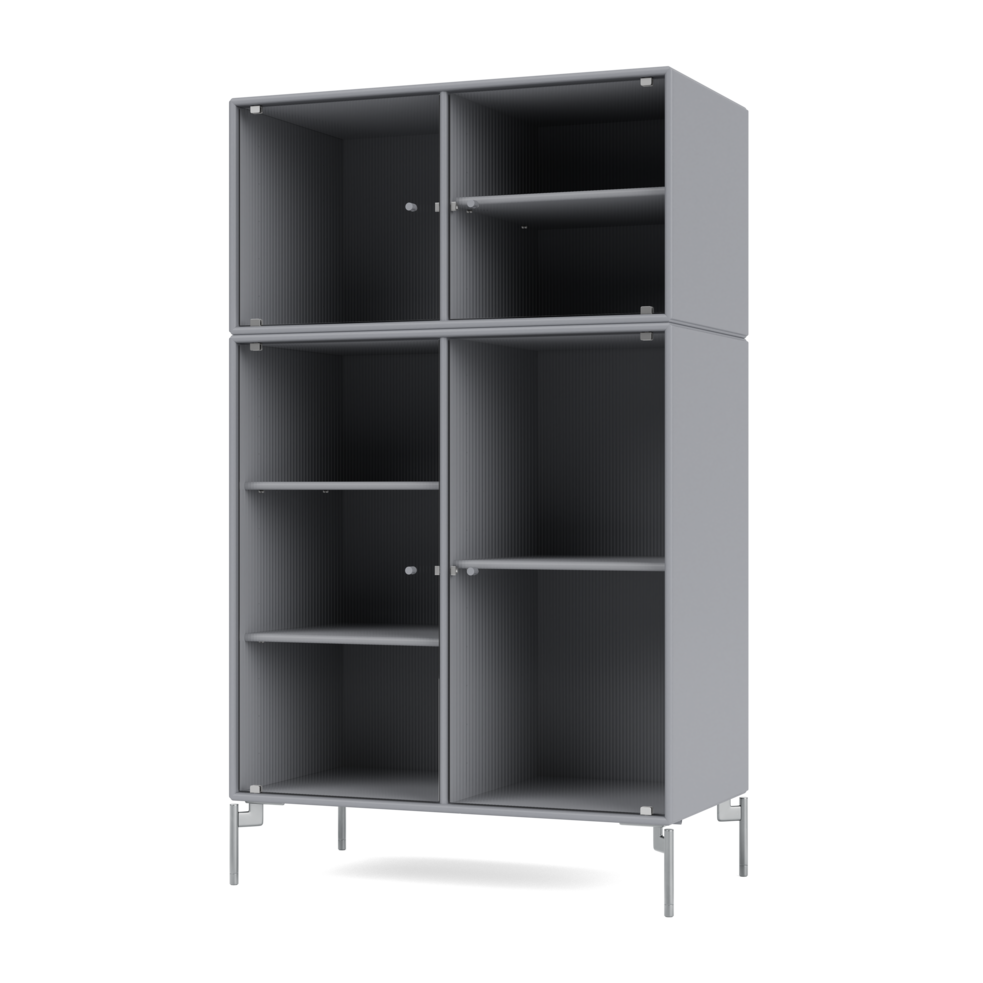 RIPPLE III is a medium-sized vitrine with 4 doors in rippled glass. It is available with legs, plinth, or suspension rails for mounting on a wall. The cabinet can be used as a high-board in the living room or for displaying tableware in the kitchen or dining area. The height makes the top of the cabinet an ideal display surface for lamps, vases, and other decorative items.