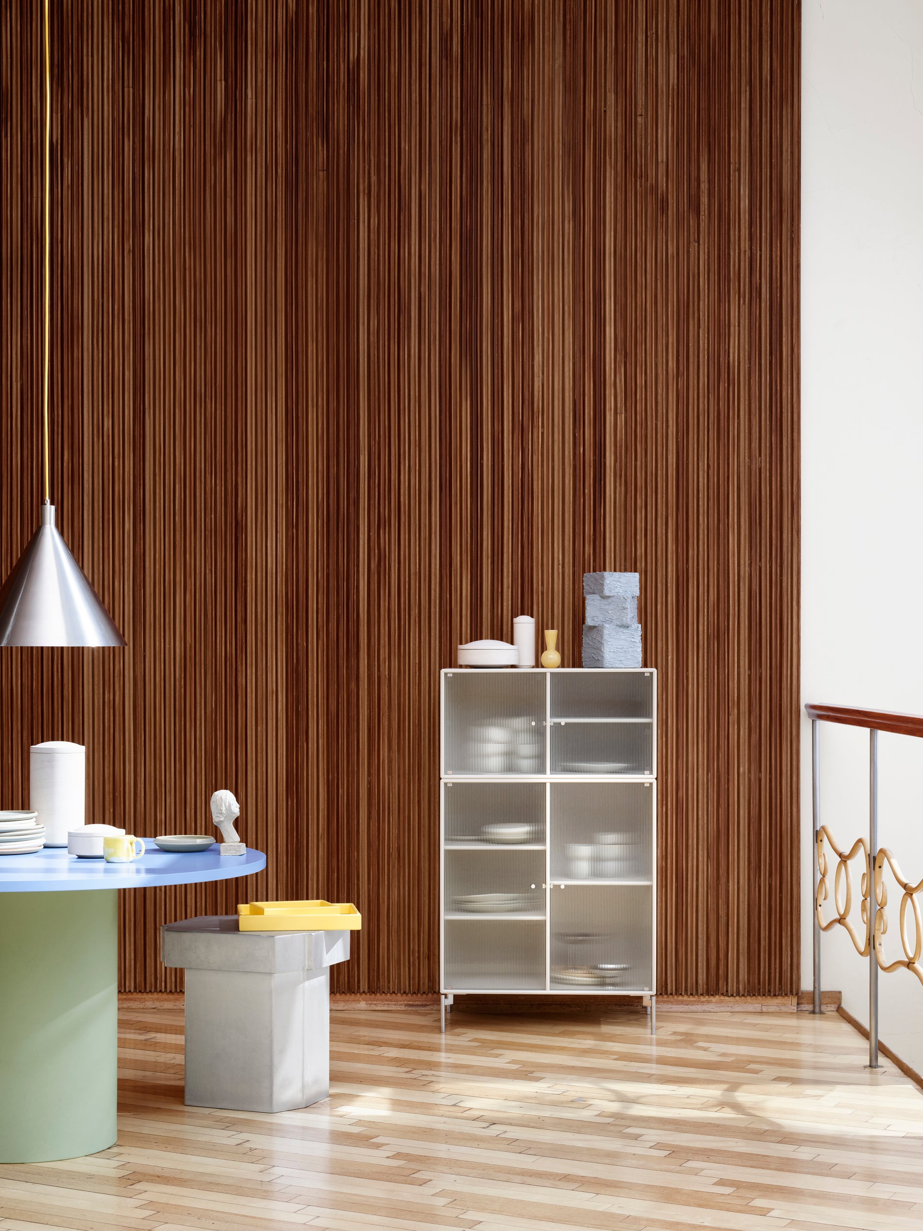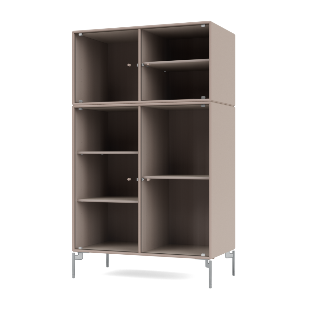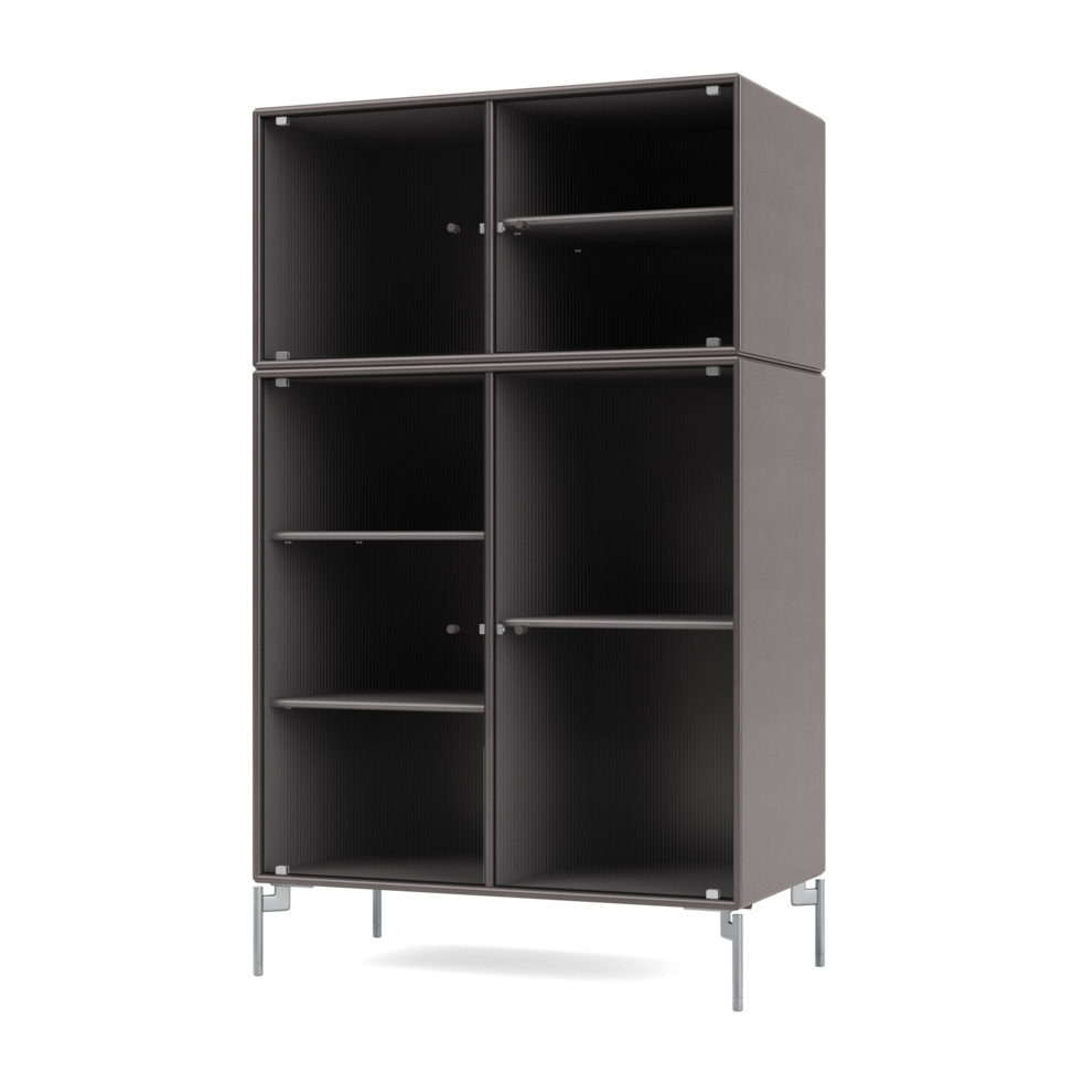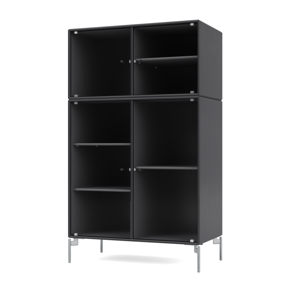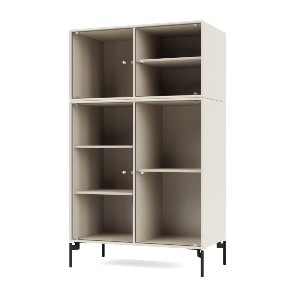 RIPPLE III is a medium-sized vitrine with 4 doors in rippled glass. It is available with legs, plinth, or suspension rails for mounting on a wall. The cabinet can be used as a high-board in the living room or for displaying tableware in the kitchen or dining area. The height makes the top of the cabinet an ideal display surface for lamps, vases, and other decorative items.