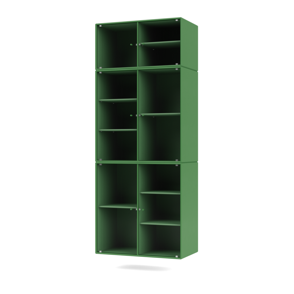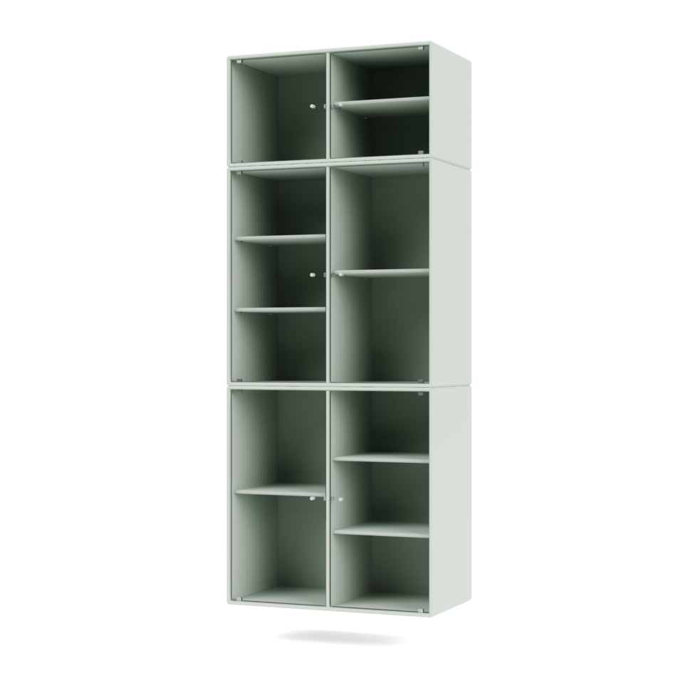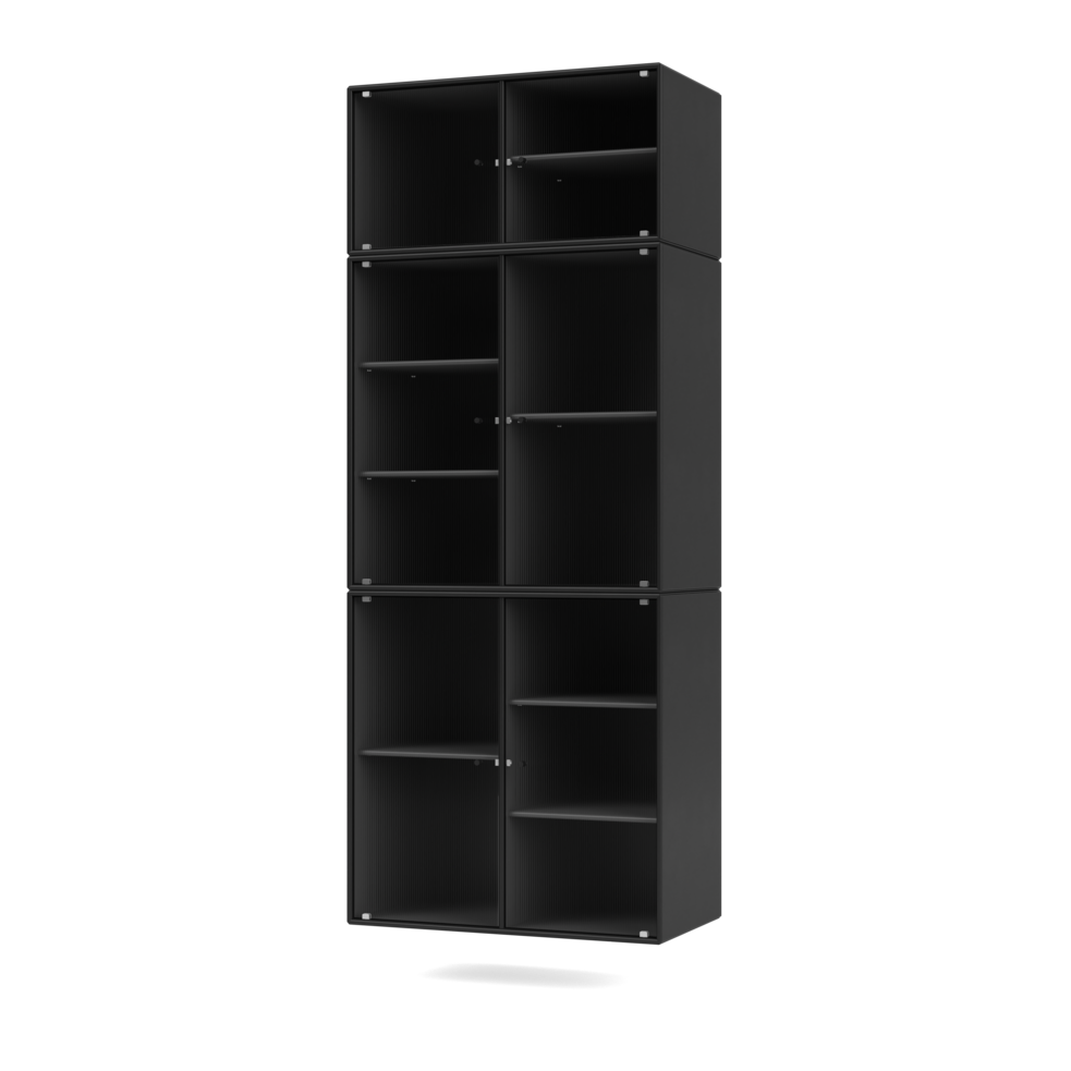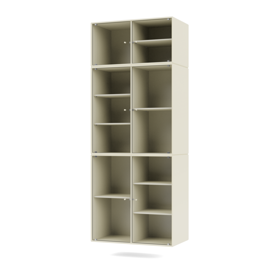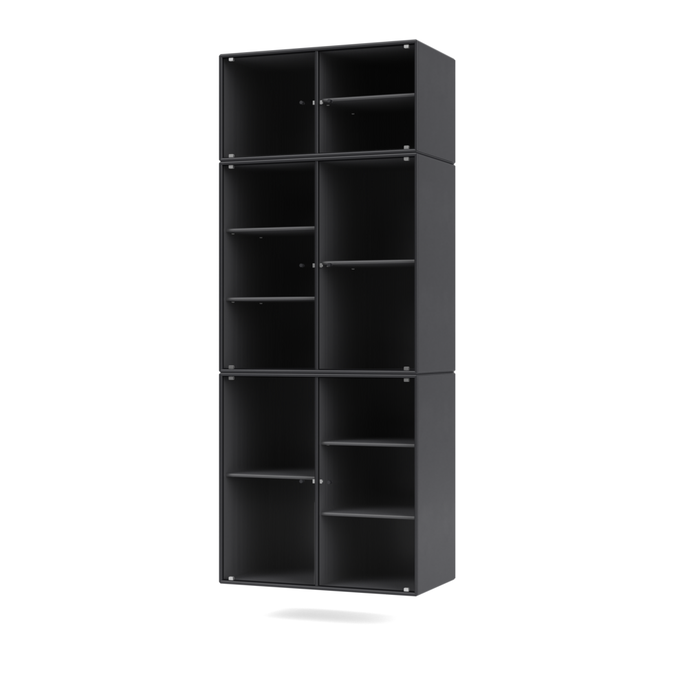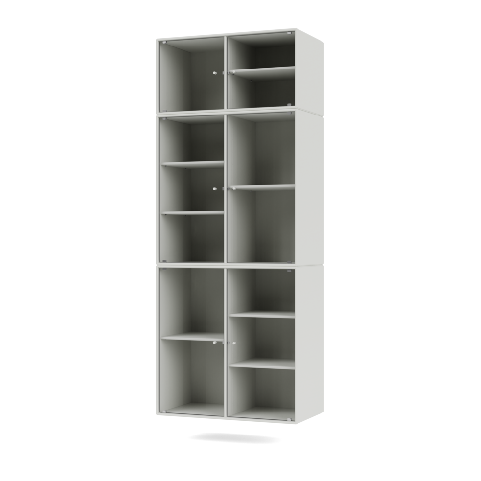 RIPPLE IV is a large vitrine cabinet with 6 doors in rippled glass. It is available with legs, plinth, or suspension rails for mounting on a wall. The cabinet is ideal for storing tableware in the dining room or kitchen. It can fit taller items like vases as well.