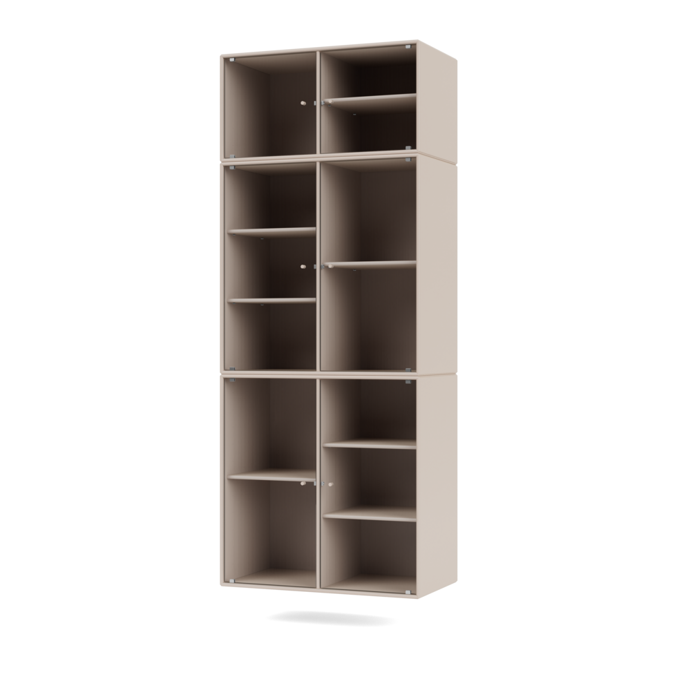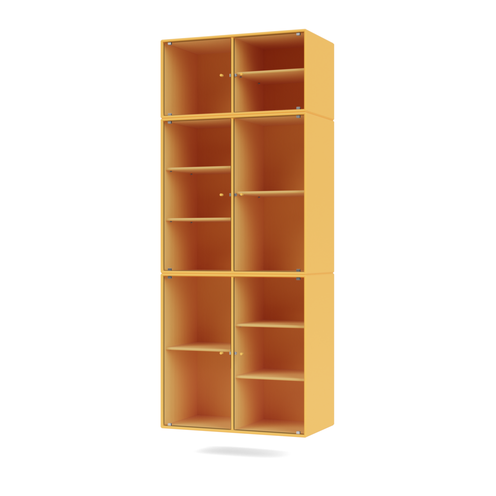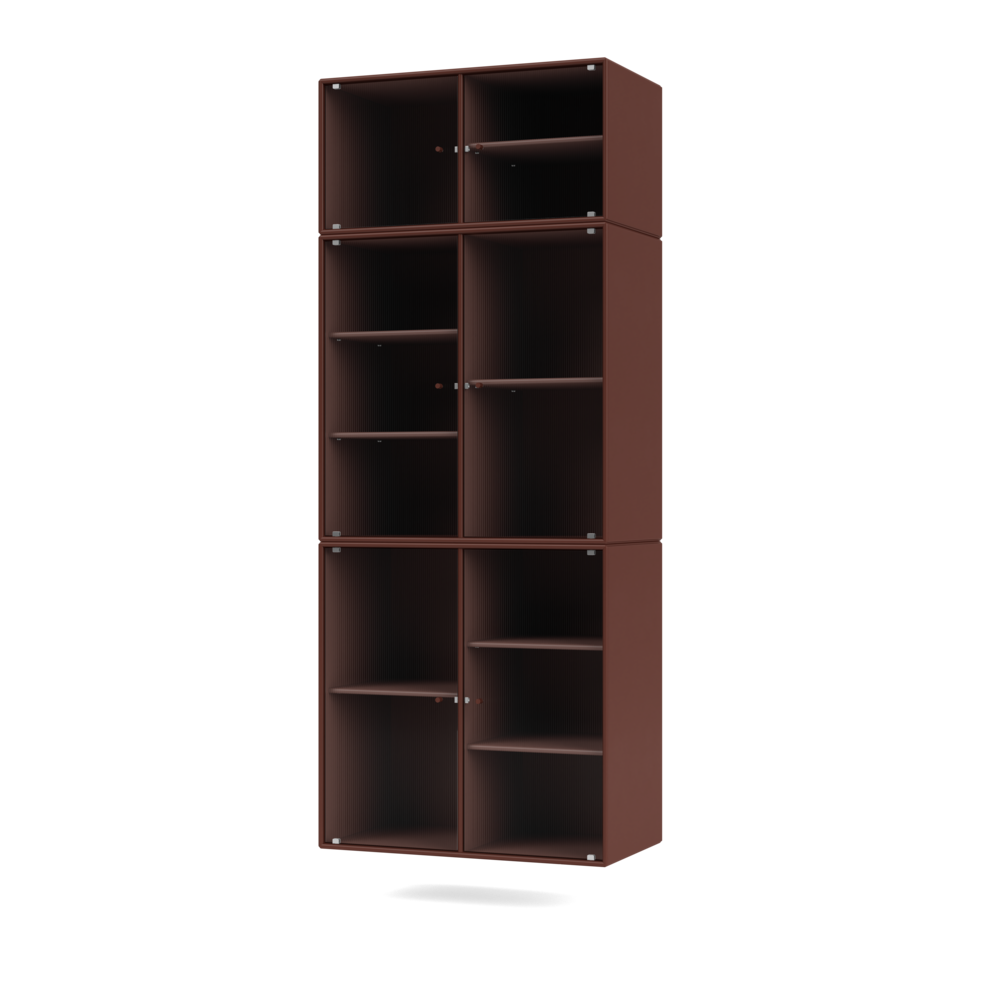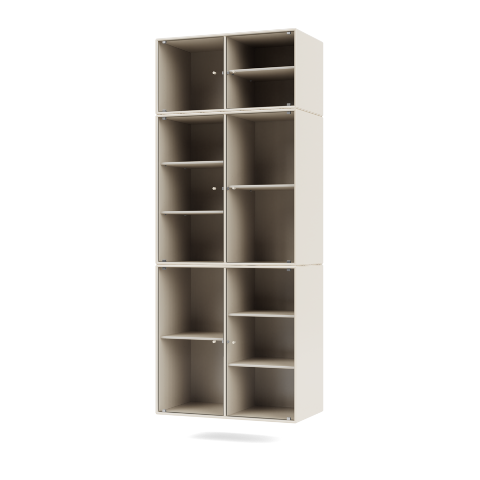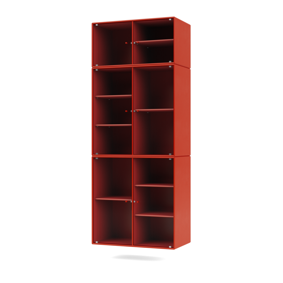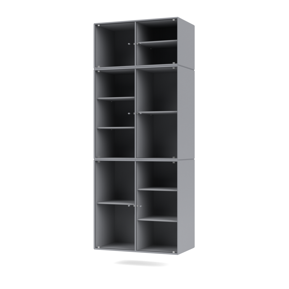 RIPPLE IV is a large vitrine cabinet with 6 doors in rippled glass. It is available with legs, plinth, or suspension rails for mounting on a wall. The cabinet is ideal for storing tableware in the dining room or kitchen. It can fit taller items like vases as well.