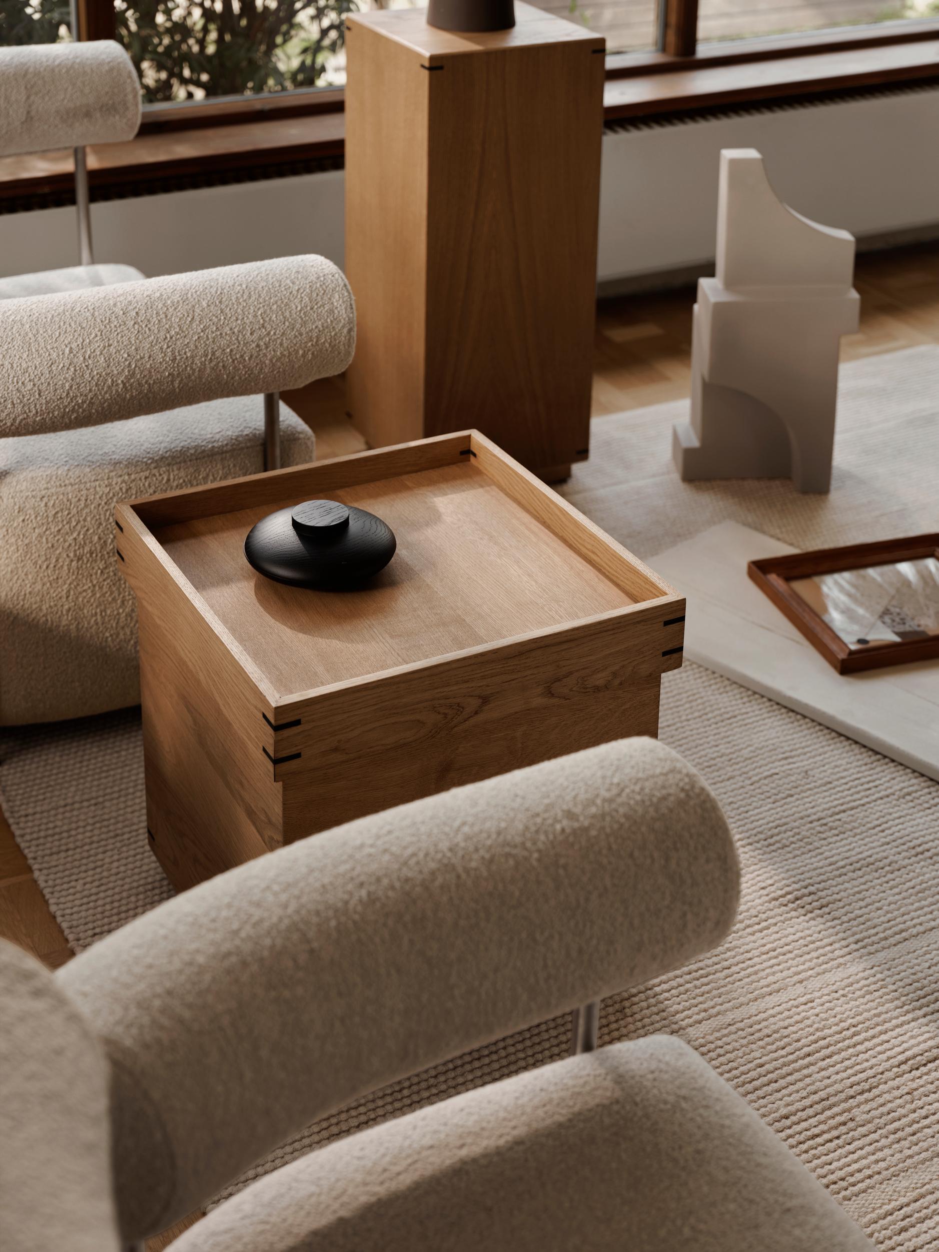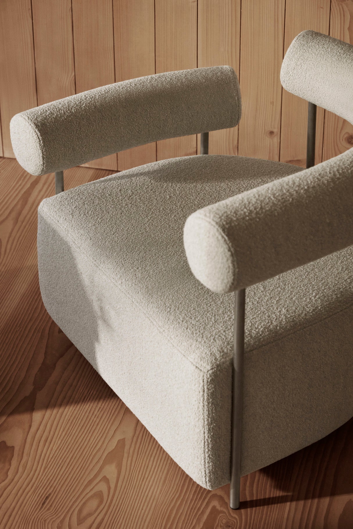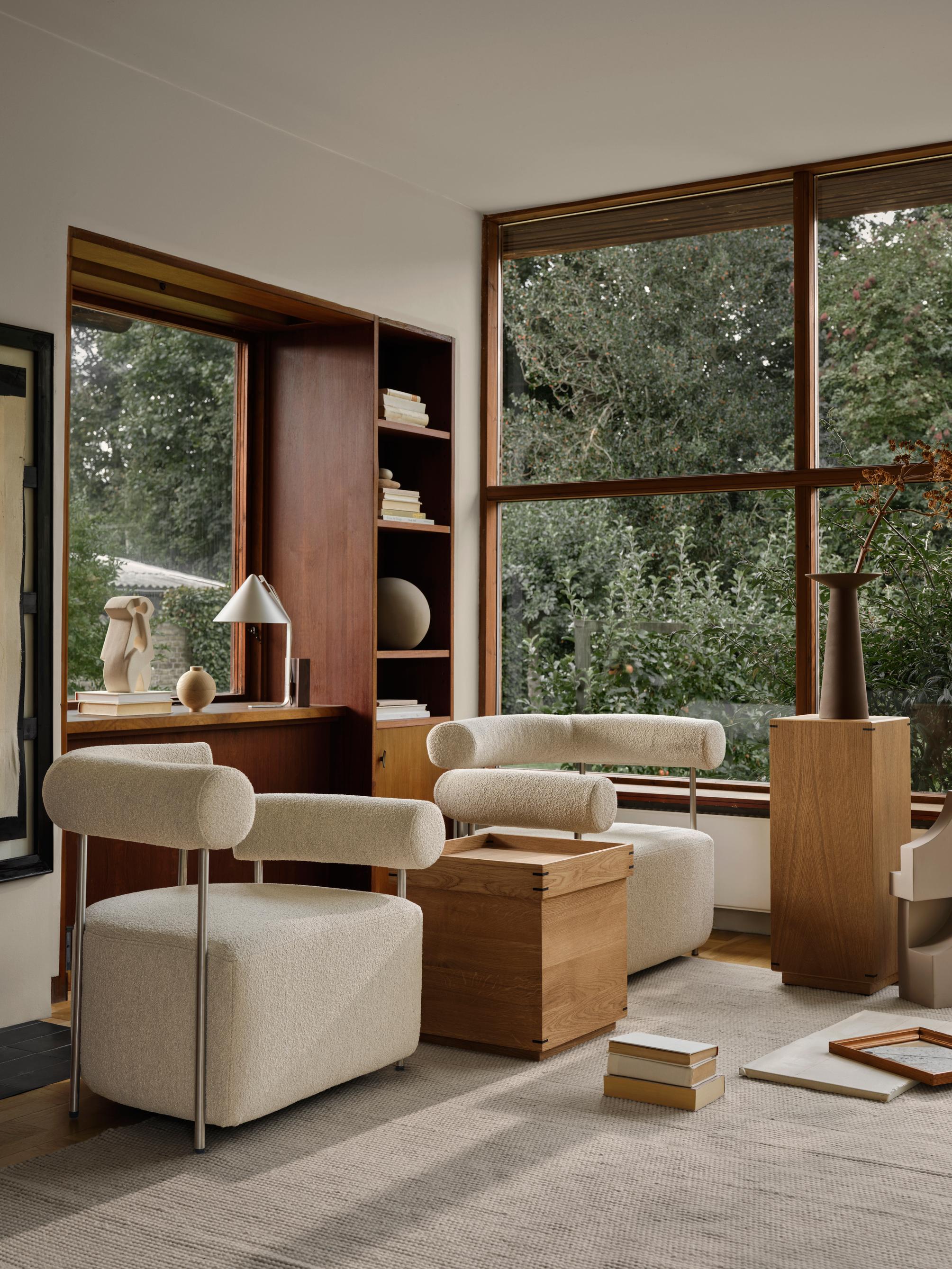 The Solitude Lounge Chair in beige offers a serene and elegant addition to any space. Embodying ethos of 'sculptural minimalism', this chair is inspired by the geometric principles of the Bauhaus movement. The unique design features offset armrests for versatile and comfortable seating options. Crafted with a luxurious, coarse-woven Italian Bouclé in a warm beige hue, the chair's fabric complements its stainless-steel frame, creating a harmonious contrast. More than just a seating option, the Solitude Chair in beige is a true statement piece, merging art and design to enhance both the aesthetics and comfort of your living space.