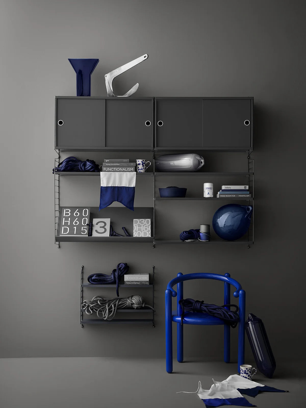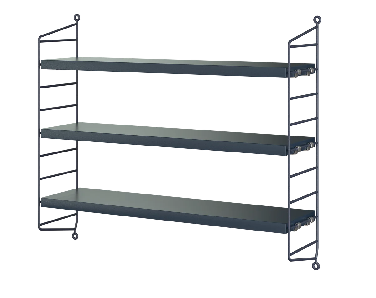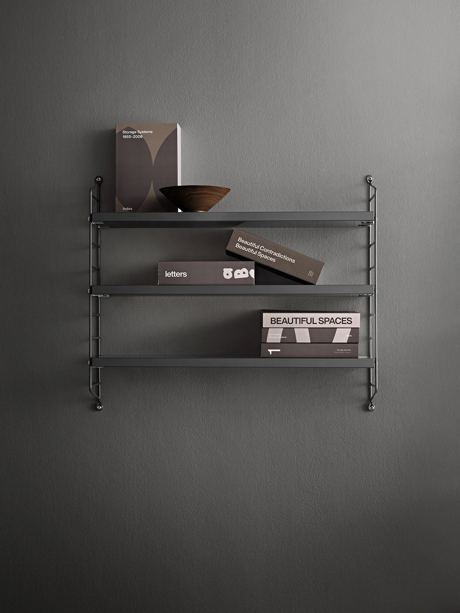 Designed by Nisse Strinning in 2005, String® Pocket became his last contribution to the Scandinavian design portfolio. In contrast to the String® shelving system, String® Pocket comes as a complete package. One Pocket shelf consists of two wall-hung panels and three shelves in a variety of color options. We offer everything from monochrome alternatives in grey and more to combinations with shelves in walnut, ash, or oak.