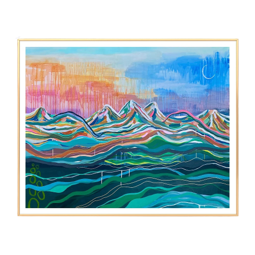 The mountain landscapes found in the PNW are what created this painting! I wanted it to be abstraction meeting landscape. Each stroke was methodically thought out and brought to life combining colors to be playful and allow your eye to travel across the canvas.