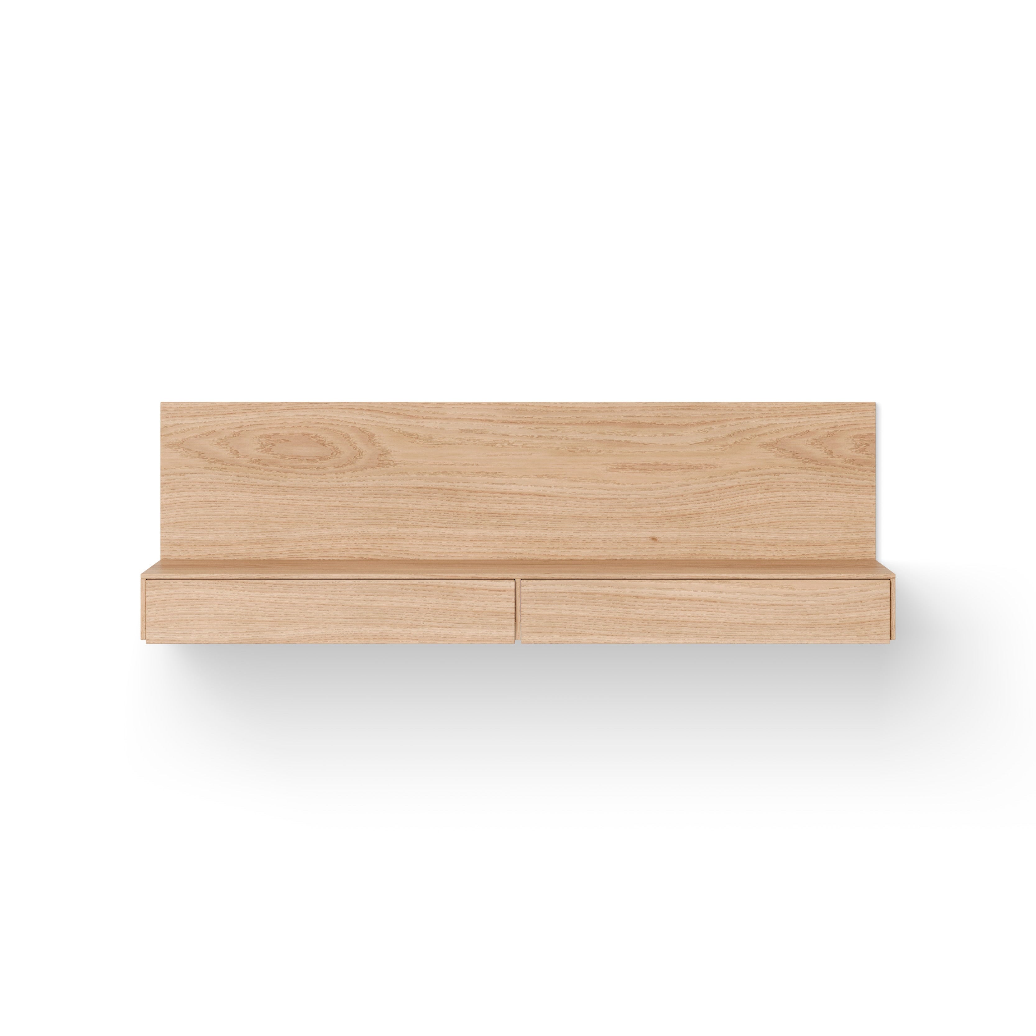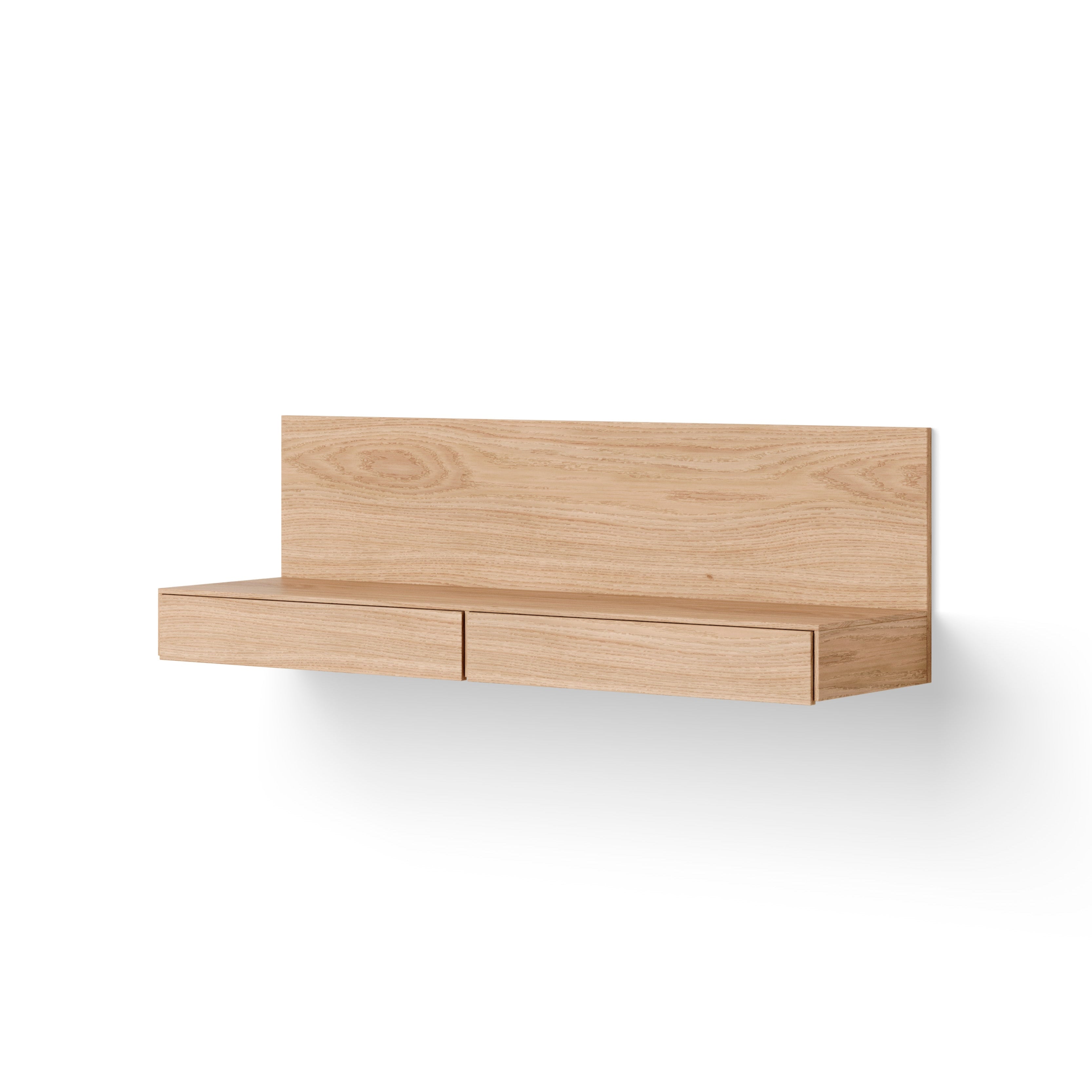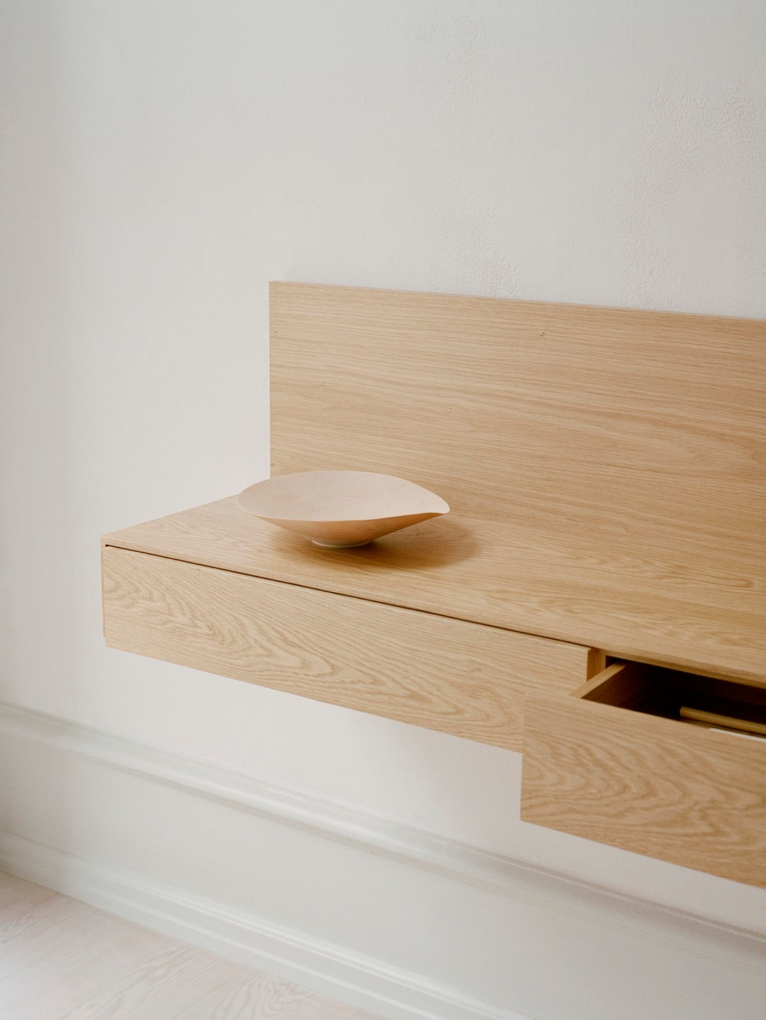 Tana is a series of wall-mounted furniture pieces designed by architect Rikke Rützou Arnved. What they all have in common is a simple expression that is neither disturbed by handles nor suspensions, but where straight lines and clean surfaces are allowed to stand in their undisturbed form. Tana consists in its cornerstone of surfaces in wood that find each other in an effortless encounter. The horizontal surface creates a ledge for objects, while its vertical surface frames and forms a calm, coherent background for what you place on the furniture.