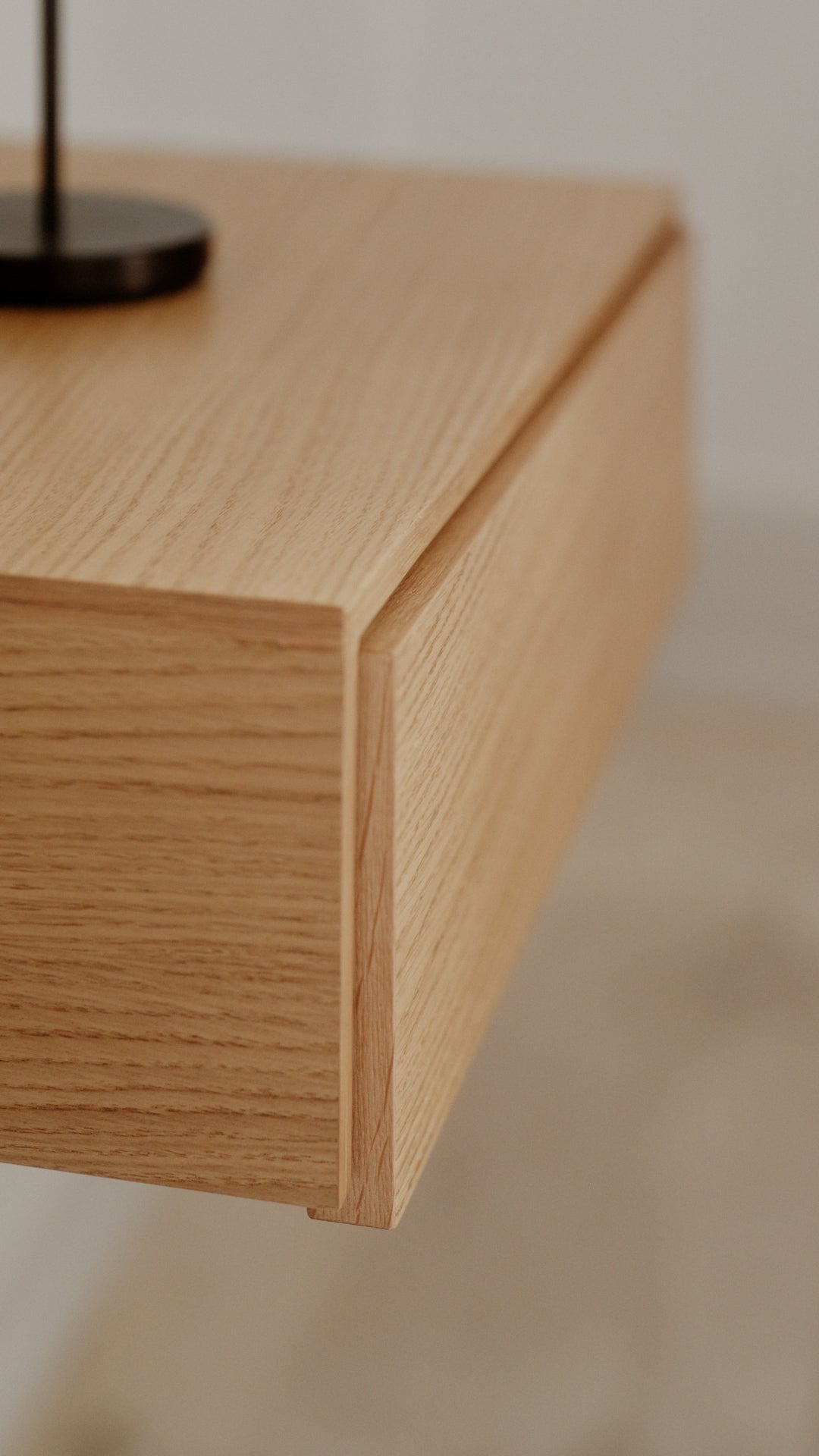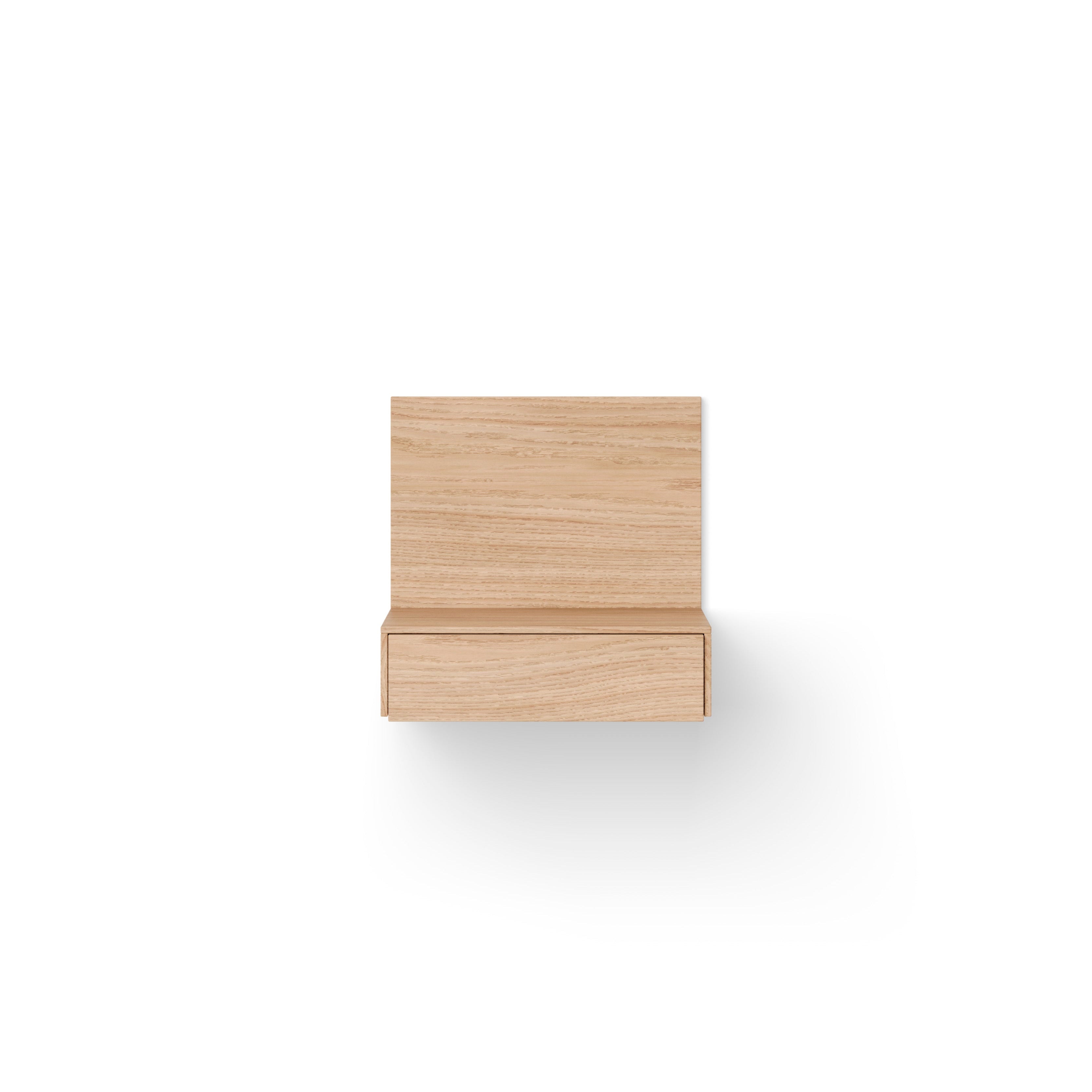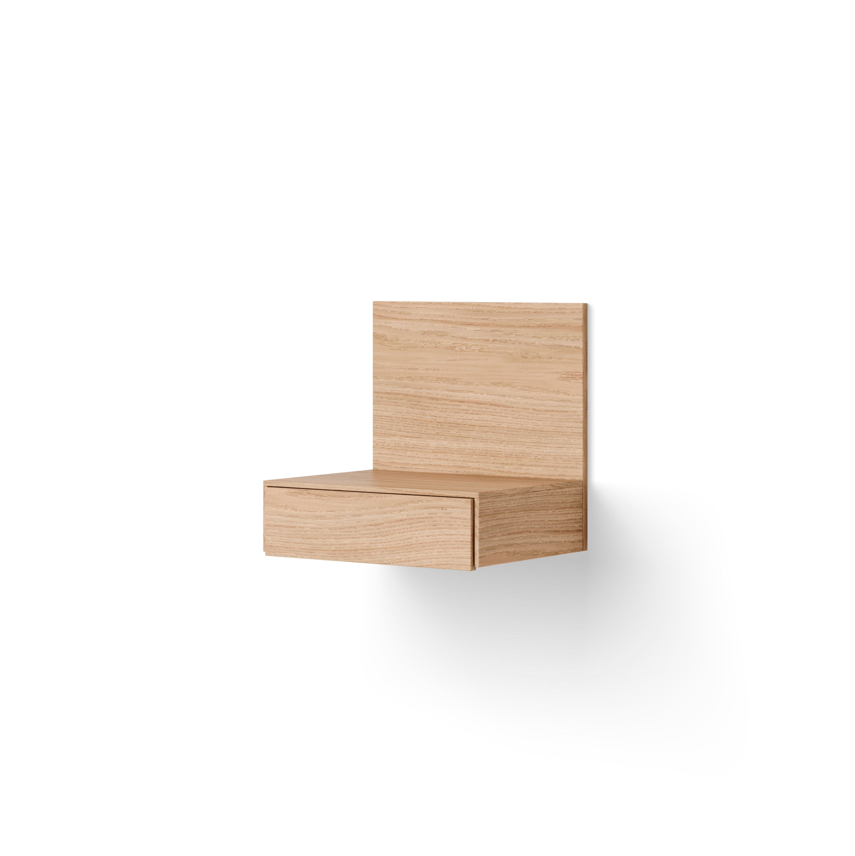 Tana is a series of wall-mounted furniture pieces designed by architect Rikke Rützou Arnved. What they all have in common is a simple expression that is neither disturbed by handles nor suspensions, but where straight lines and clean surfaces are allowed to stand in their undisturbed form. Tana consists in its cornerstone of surfaces in wood that find each other in an effortless encounter. The horizontal surface creates a ledge for objects, while its vertical surface frames and forms a calm, coherent background for what you place on the furniture.