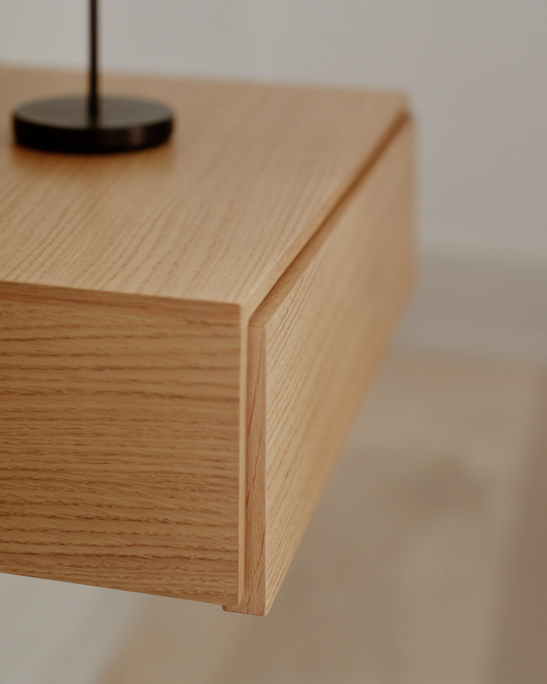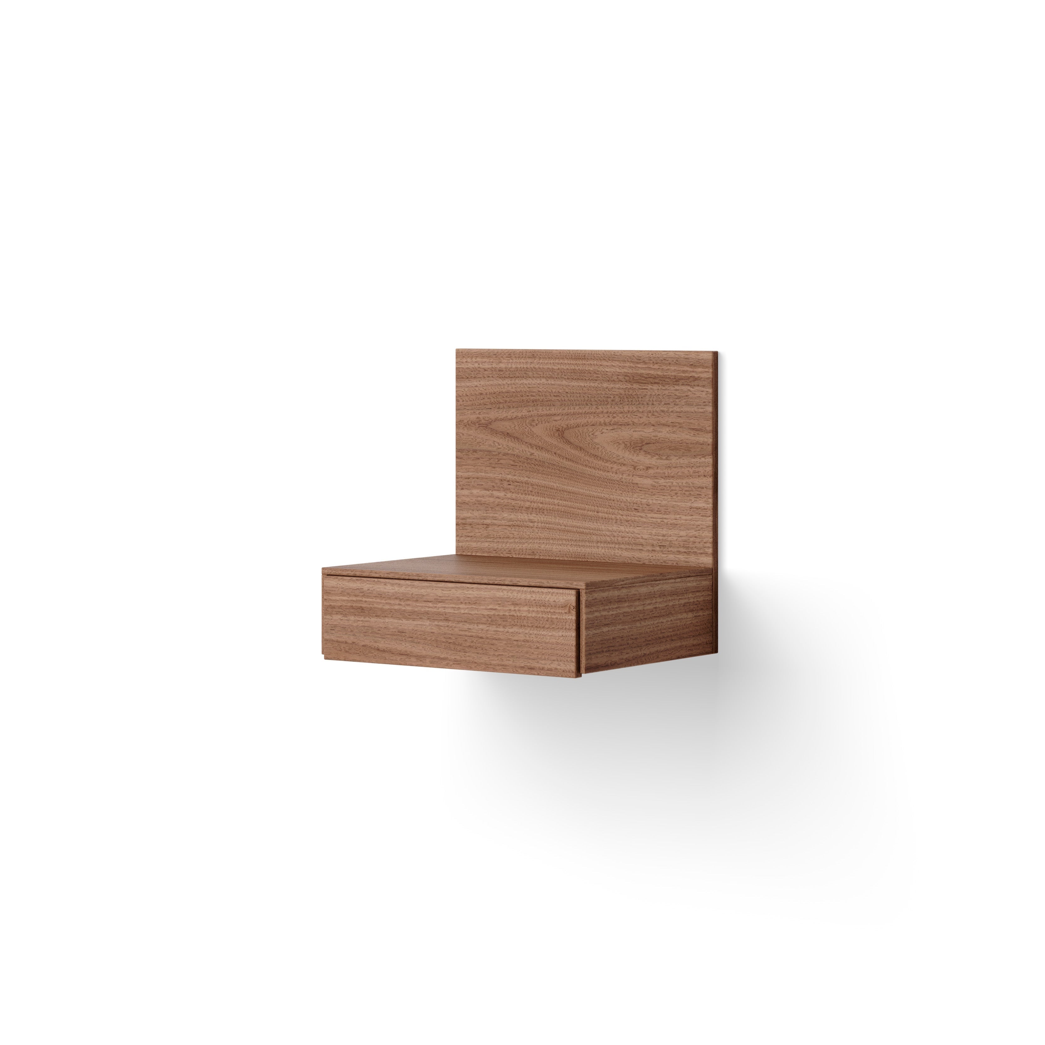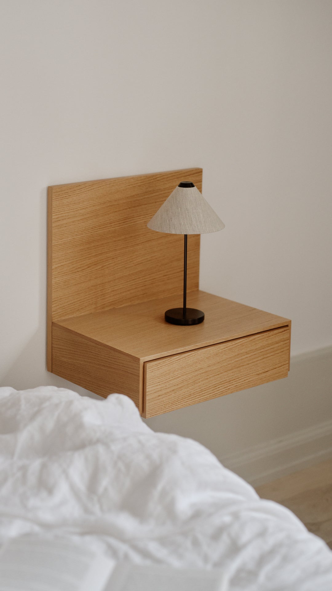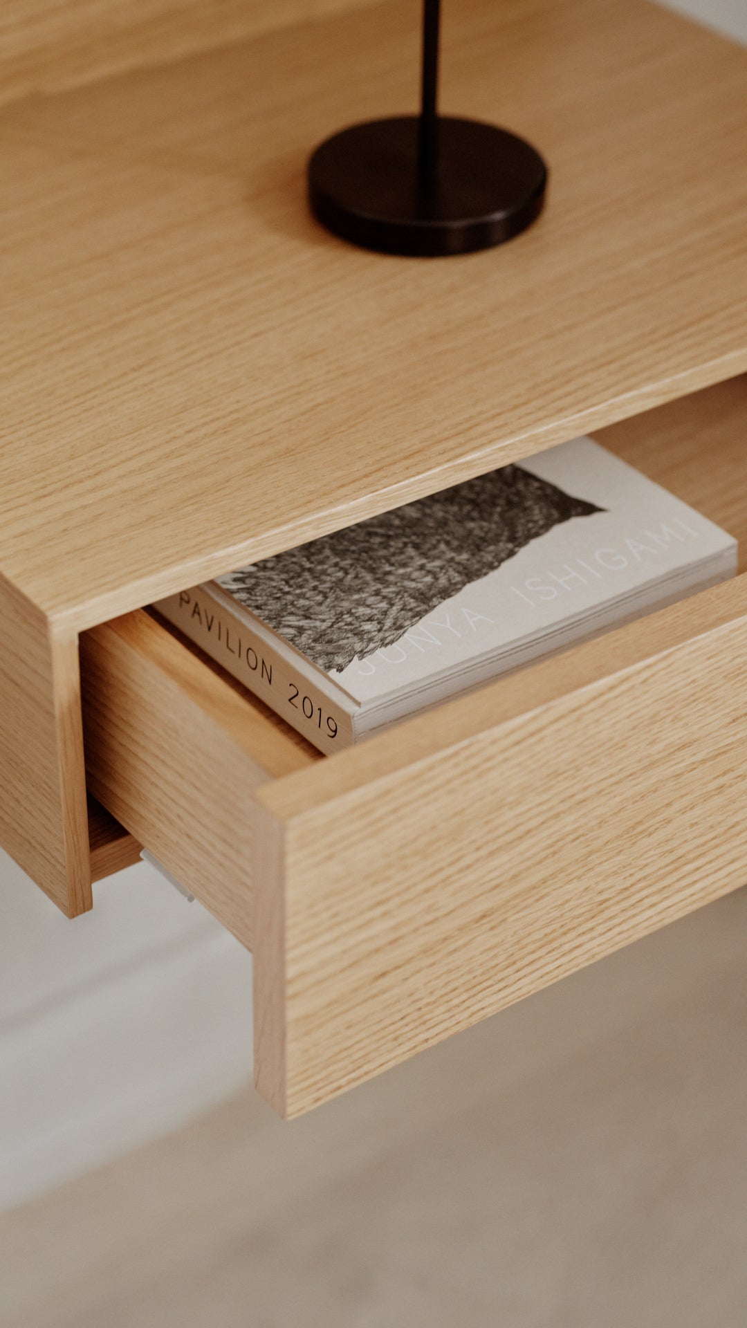Tana is a series of wall-mounted furniture pieces designed by architect Rikke Rützou Arnved. What they all have in common is a simple expression that is neither disturbed by handles nor suspensions, but where straight lines and clean surfaces are allowed to stand in their undisturbed form. Tana consists in its cornerstone of surfaces in wood that find each other in an effortless encounter. The horizontal surface creates a ledge for objects, while its vertical surface frames and forms a calm, coherent background for what you place on the furniture.