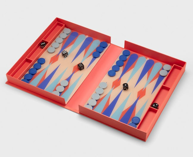 Your new favorite Backgammon set reinvented to look equally good played or displayed in a concept we call "Coffee Table Games". Our Backgammon opens up as a book and is played on a thin layer of acrylic with plastic game pieces. It comes with easy-to-read instructions in English, French and German. Recommended for up to four players and ages 5+.