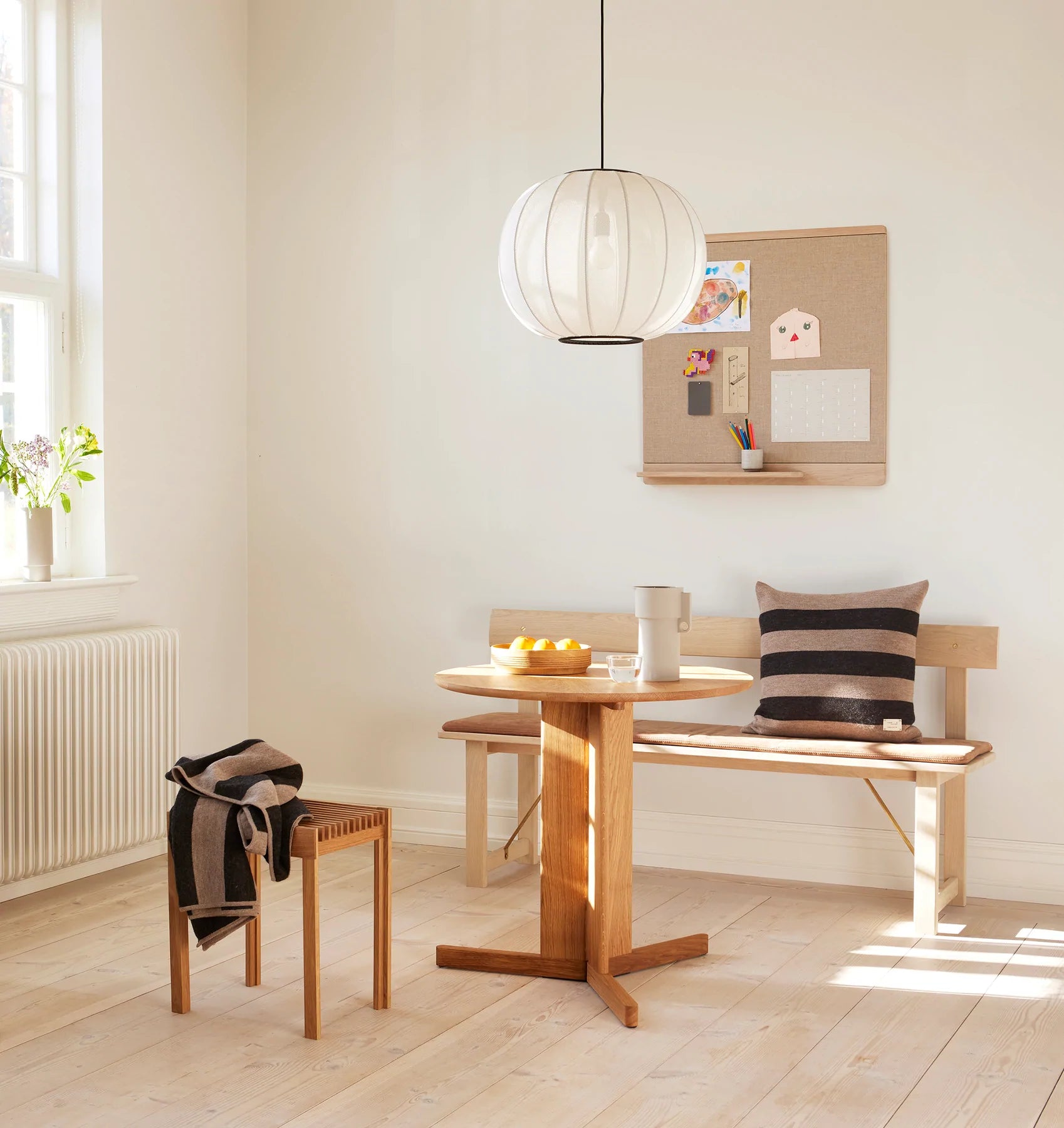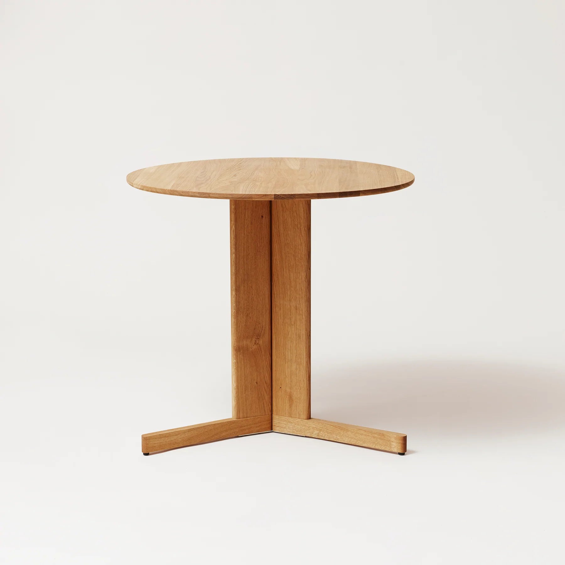 A center point of free-floating solid oak elements holds the round table and creates a contradiction of lightness and a substantially dense round table. The free space of the three legs adds to the lightness and special visual complexity of the table. The three legs make it possible to sit around the table without anyone getting into a conflict with their legs.