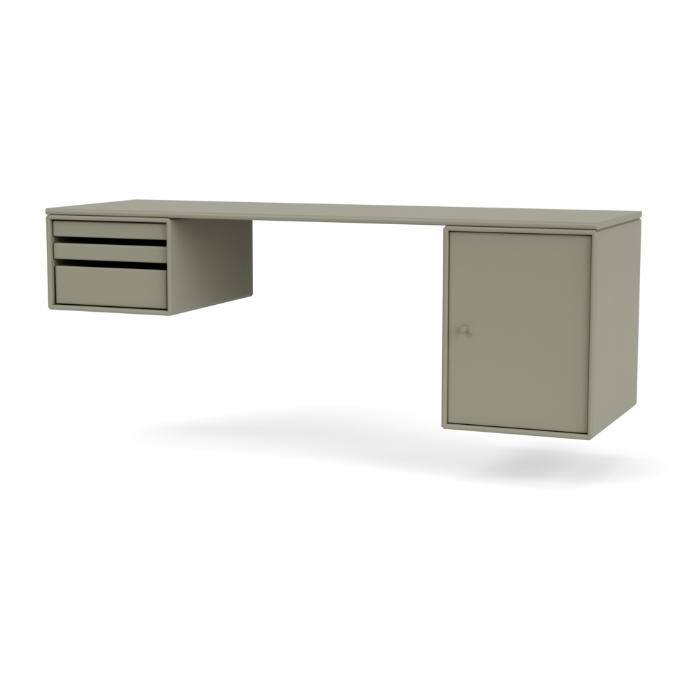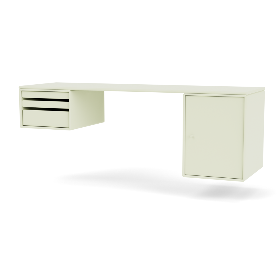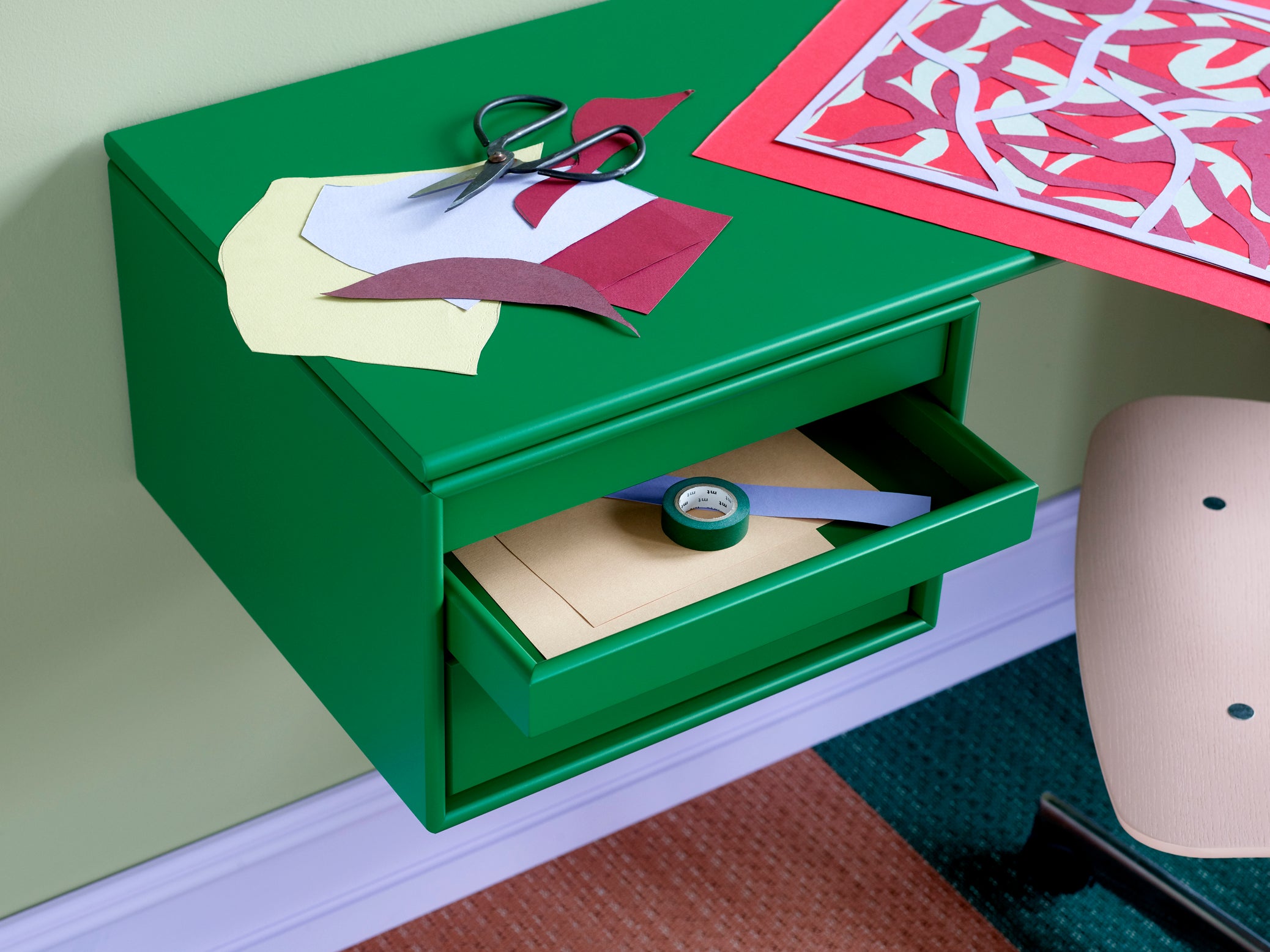 WORKSHOP has tray modules on one side that can be removed entirely from the module. On the other side is a smaller cabinet to store books or office supplies.