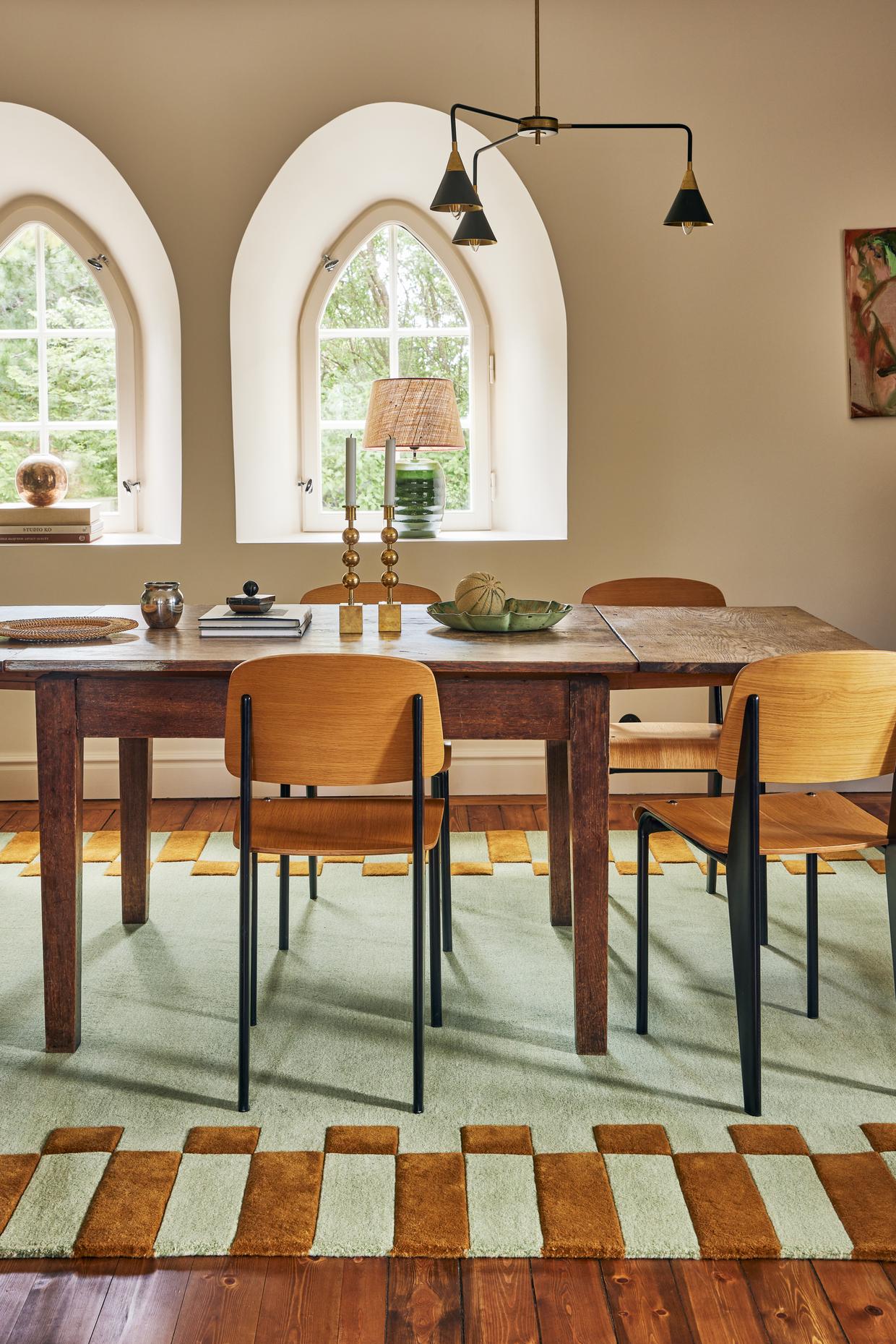 Crystal is an irregular octagon inspired by Italian 3D patterns with a hint of Memphis, described by Teklan as “maxed in every way.” Box has a more minimalist design using soft tonal color to create a 3D optical illusion, while Frame is designed to do just that to your room, using check and stripe motifs to create a highly usable but impactful floor covering.